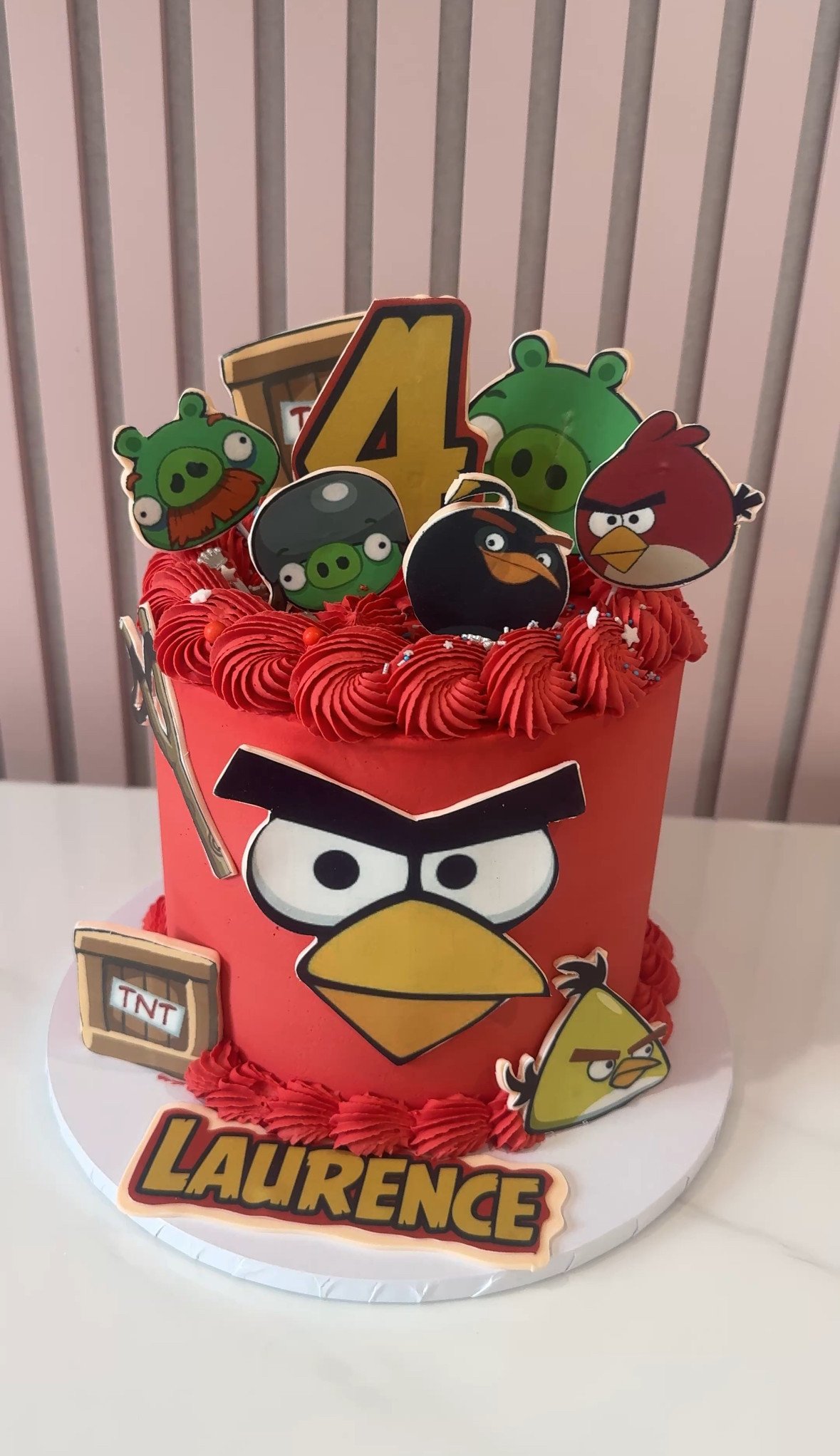 Bring the fun and chaos of Angry Birds to life with this bold and playful birthday cake. Finished in vibrant red buttercream with detailed character toppers, this design features the iconic birds and pigs, TNT crates and a striking number topper to mark the celebration. The expressive face on the front creates instant impact, making it a brilliant centrepiece for a gaming-themed party. Perfect for little fans who love action, colour and a touch of mischief.