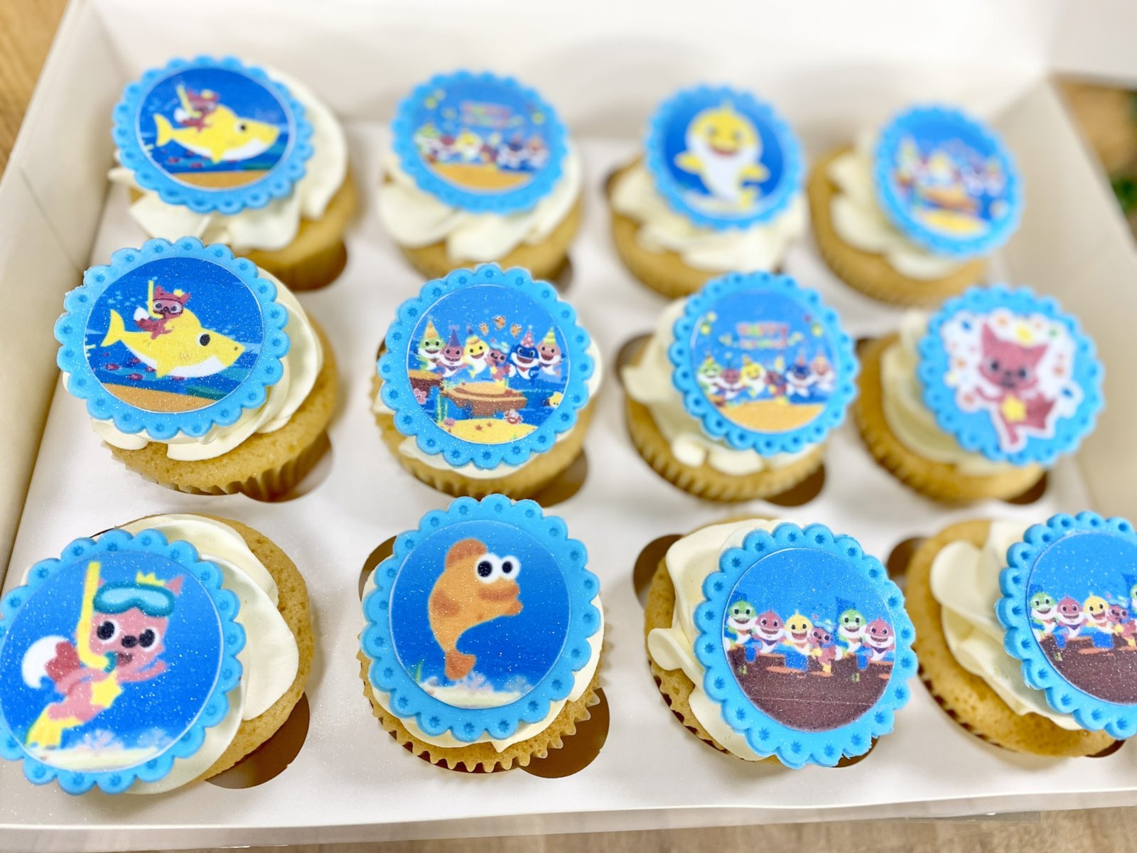 These Baby Shark Cupcakes are bright, playful, and full of fun, featuring smooth buttercream swirls topped with edible Baby Shark character discs in vibrant shades of blue. Designed to delight younger children, each cupcake showcases a different character scene, creating a colourful and engaging box that’s perfect for parties, celebrations, or themed events. A cheerful option that instantly adds personality to any table.