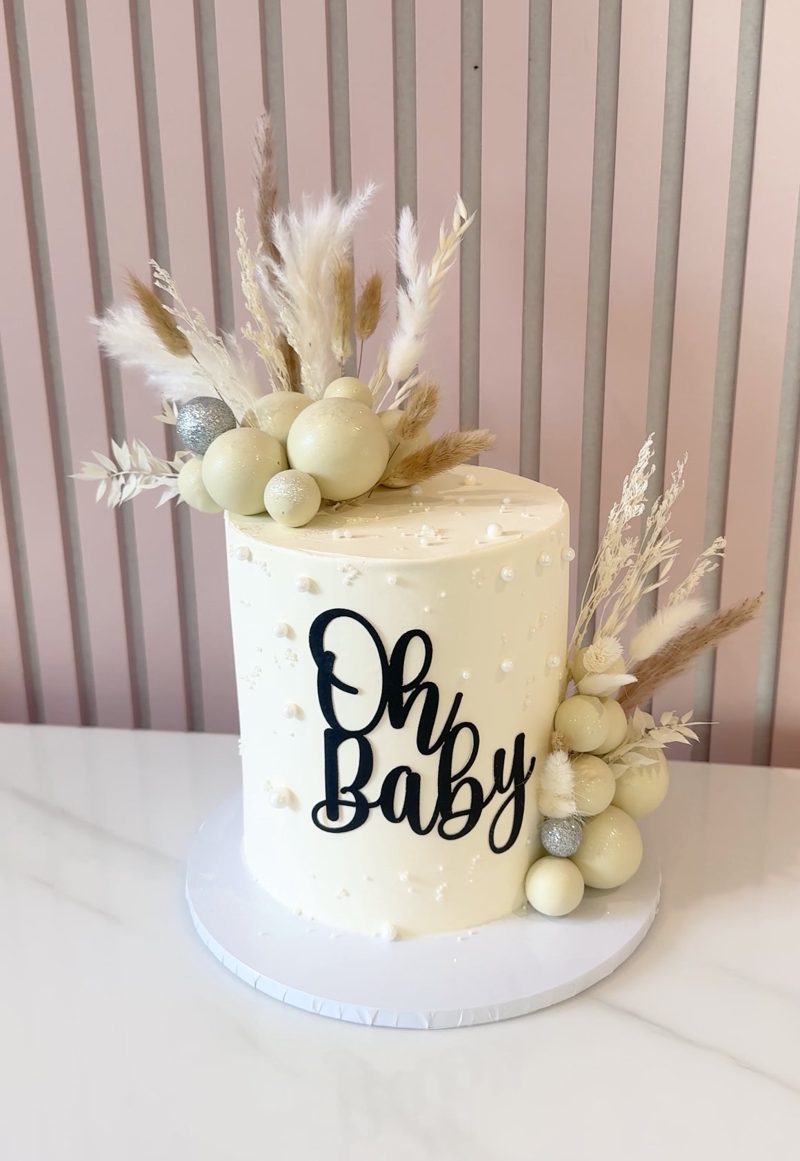 Celebrate a beautiful new beginning with this elegant neutral-toned baby shower cake. Decorated with soft pampas, pearl details, and ivory decorative spheres, it’s a sophisticated and modern design that suits any gender. The “Oh Baby” script adds a charming finishing touch, making it a standout centrepiece for your celebration.