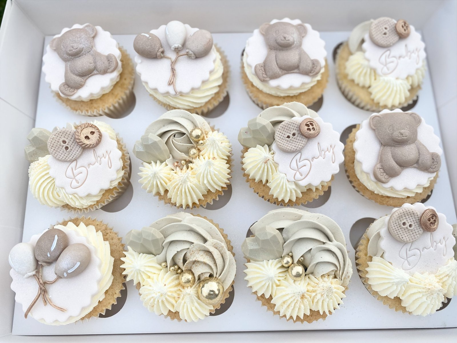 These elegant baby shower cupcakes are finished in a soft neutral palette, featuring delicate buttercream swirls and refined decorative details. Designed to suit show-stopping baby showers or celebrations ahead of a new arrival, they offer a timeless, understated look that works beautifully for any setting. The design can be adapted to suit your preferred colours or theme, making them a thoughtful and stylish centrepiece for the occasion.