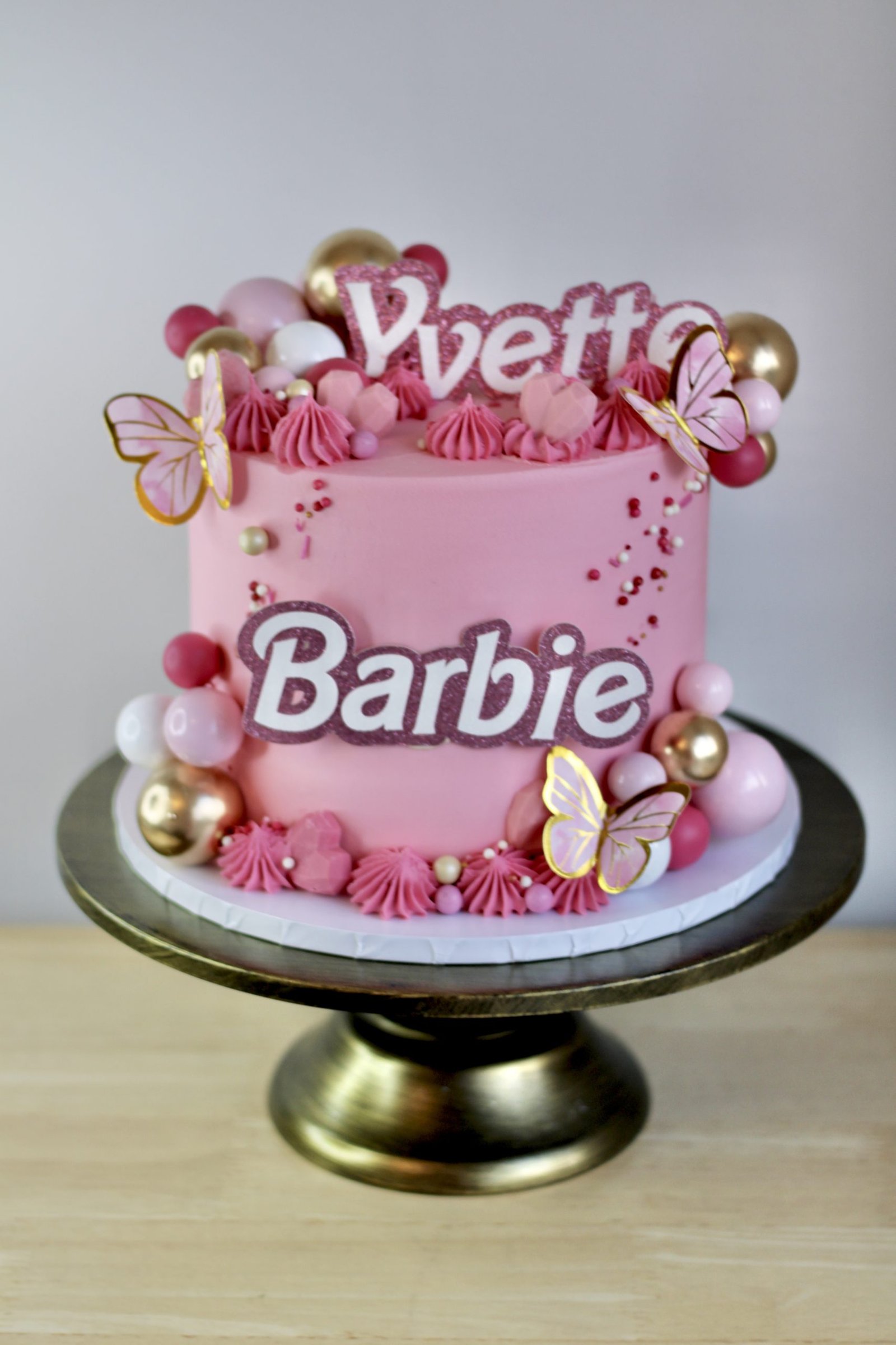 Bring the magic of Barbie to life with this fabulous pink cake, designed for a true fashionista! Covered in dreamy pink buttercream and decorated with delicate piped swirls, shimmering pearls, and decorative spheres, this cake is a showstopper. Elegant butterflies and dazzling edible embellishments add a touch of glamour, making it the perfect centrepiece for a Barbie-themed birthday celebration.
