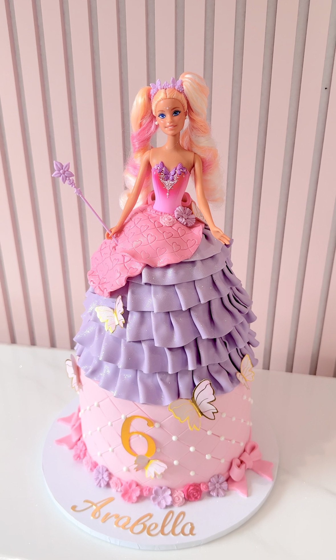 This beautiful Barbie doll cake is a showstopping two tier design, featuring a glamorous princess-style silhouette with cascading lilac ruffle layers. The detailed fondant skirt creates soft movement and texture, while delicate butterflies, pearl-style accents, and floral details add a magical finishing touch. The bodice blends pink and lilac tones for a dreamy, fairy-tale look, making this cake a stunning centrepiece for a special birthday celebration. Perfect for fans of Barbie, this design combines elegance, colour, and playful charm in one unforgettable cake.