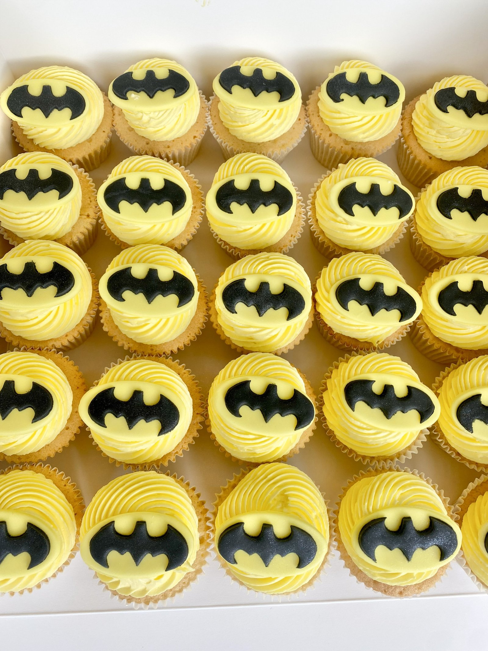 These Batman Cupcakes feature bold yellow buttercream swirls topped with the iconic black bat emblem, creating a clean and instantly recognisable superhero look. Striking yet simple, they’re perfect for fans of all ages and make a strong visual impact whether displayed on their own or paired with a matching celebration cake. Designed to feel fun but polished, they’re ideal for themed parties and superhero celebrations.