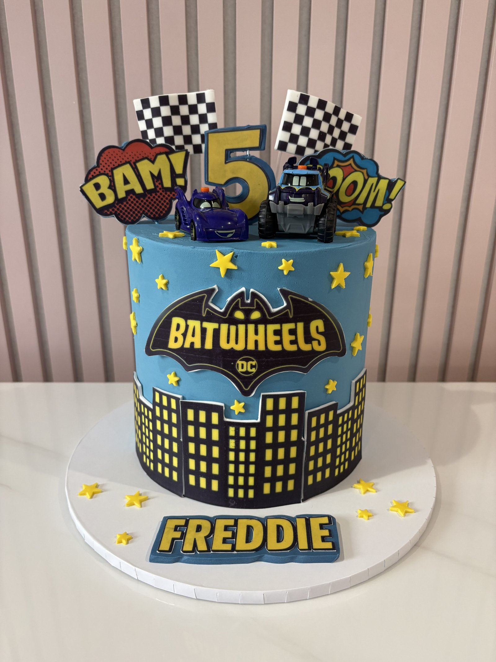 Inspired by the action-packed DC series, this Batwheels cake is bold, vibrant and full of superhero energy. Finished in a deep blue buttercream, the design features a striking Batwheels logo, a Gotham City skyline wrap and bright yellow stars scattered across the cake for a dynamic night-time effect. Comic-style “Bam!” and “Boom!” toppers add a fun, playful touch, while racing flags and character vehicles bring the theme to life. A high-impact design that makes a standout centrepiece for young superhero fans.