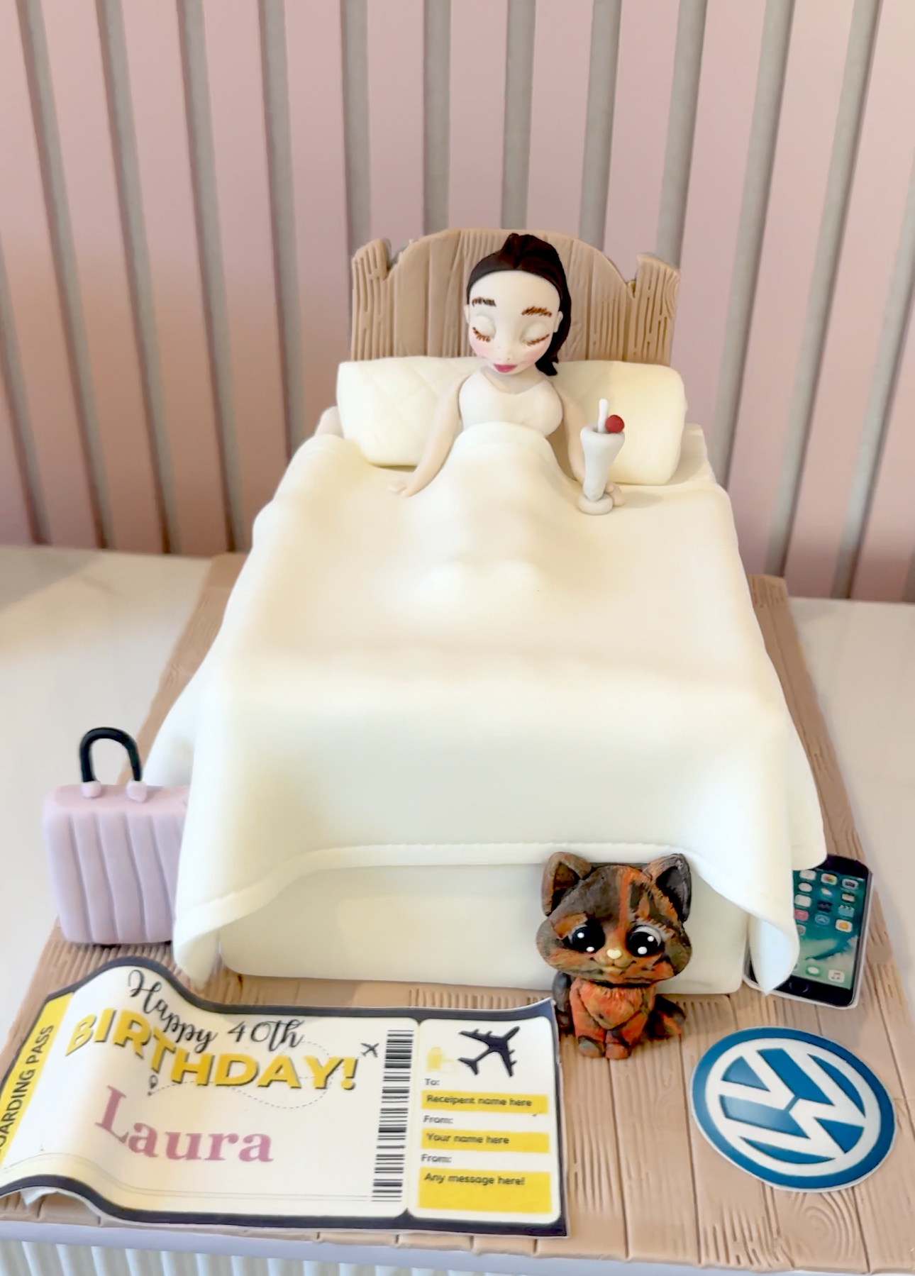This creative and charming cake is perfect for the birthday girl who loves a good lie-in and a holiday! Designed as a cosy bed scene, it features a handmade icing figure lounging under a quilt, complete with decorative items (which can be tailored) such as a cocktail in hand, suitcase ready, and a cute little cat companion at her feet. Details like a phone, a boarding pass, and the Volkswagen badge (which can be tailored) add a personal touch to this beautifully customised celebration.