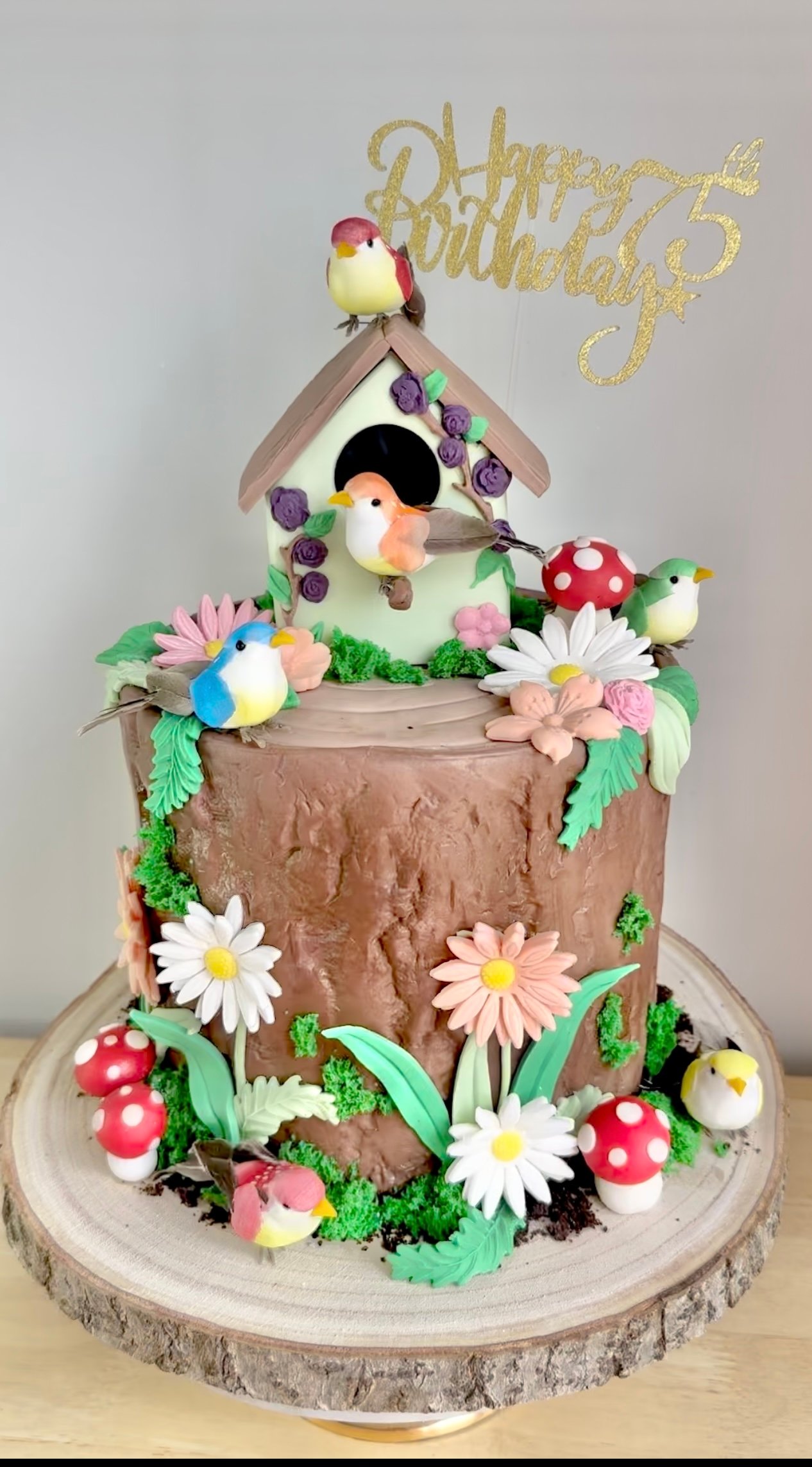 Step into a magical woodland scene with the Birdsong Bliss Cake, a masterpiece inspired by nature’s beauty. Crafted to resemble a rustic tree stump, this cake is adorned with delicate sugar flowers, vibrant greenery, and a charming edible birdhouse. The intricate fondant details, including realistic mushrooms and vines, create a whimsical forest setting. Perched around the cake, lifelike artificial birds complete the enchanting scene. Perfect for nature lovers, garden enthusiasts, or anyone who appreciates a touch of woodland magic.