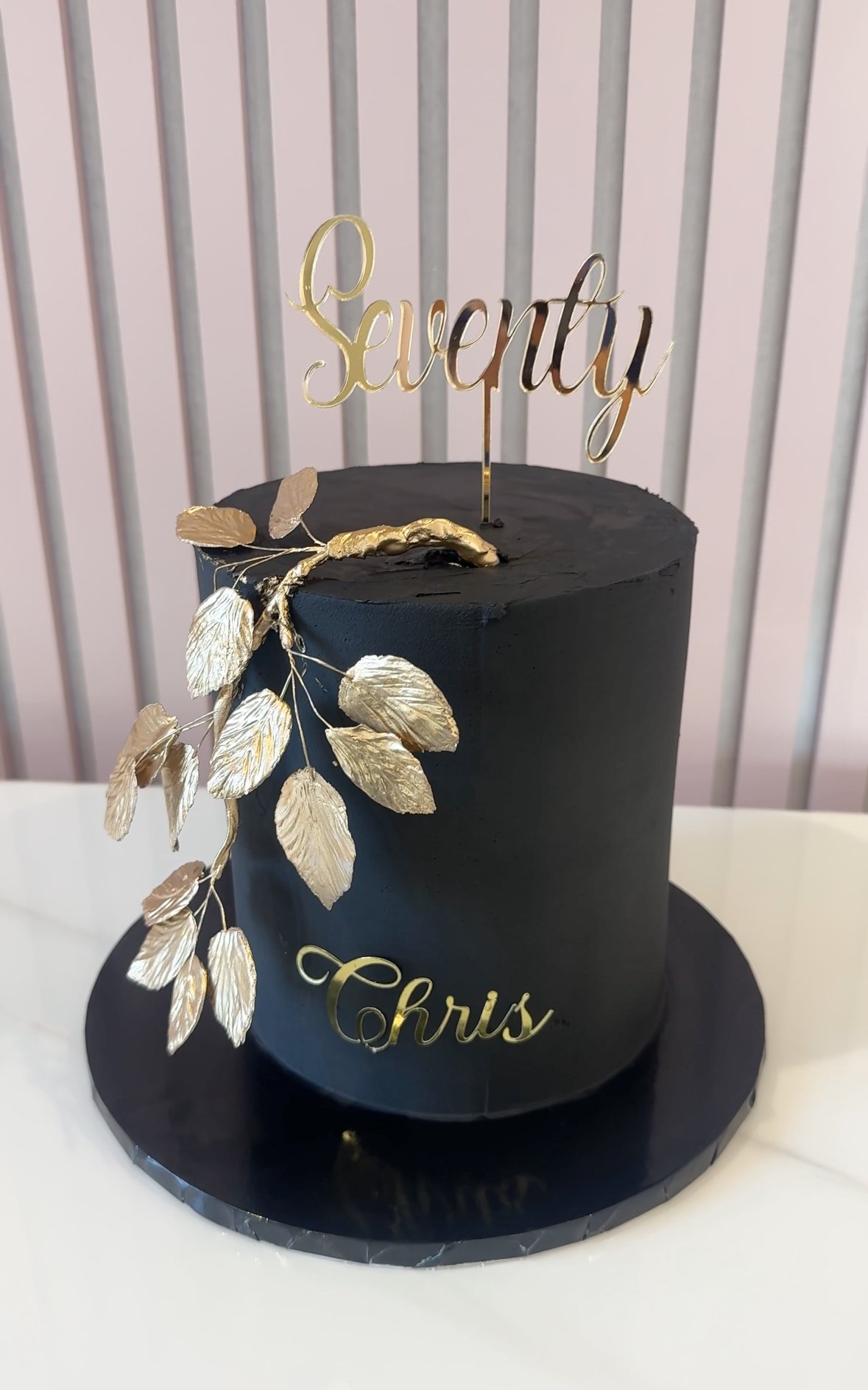 This sleek black cake is the epitome of understated luxury, featuring a tall silhouette adorned with metallic gold leaves and custom name detailing. Perfect for milestone celebrations, it makes a bold yet elegant statement and can be tailored for any age or occasion.