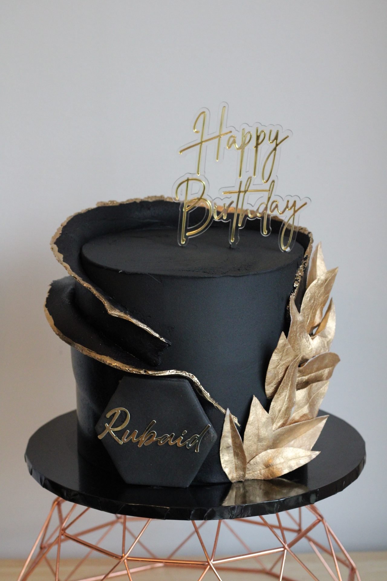 Make a bold statement with the Black Luxe Ruffle Cake, a stunning modern design that exudes elegance and sophistication. This deep black buttercream cake features striking gold-edged ruffle detailing, adding a unique sculptural effect. Accented with gold metallic leaves and a personalised name plaque, this cake is perfect for milestone birthdays, luxury celebrations, and those who love a contemporary aesthetic. A true masterpiece for any special occasion!