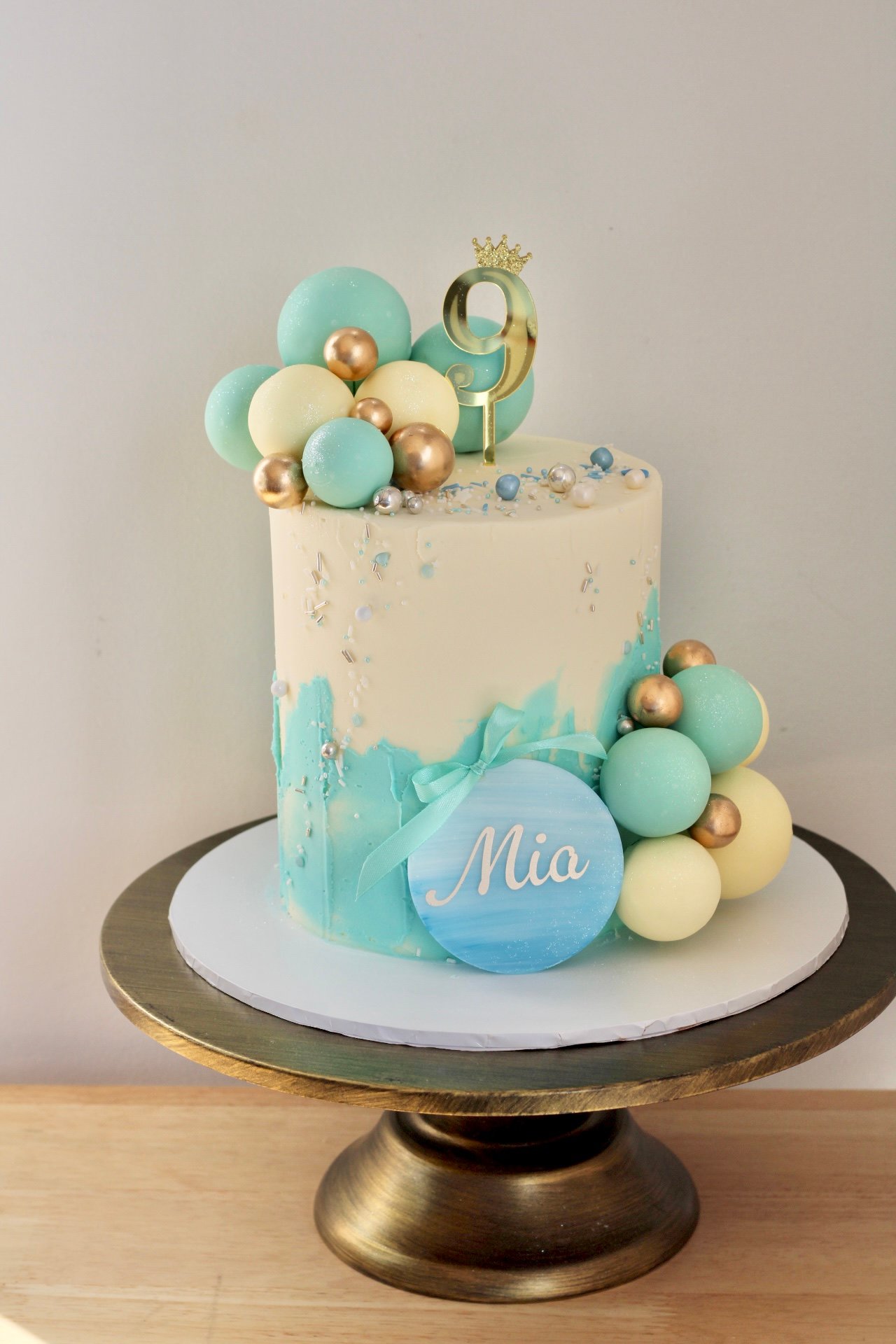 A dreamy birthday cake fit for a little princess! This enchanting design features a soft ivory base with delicate blue watercolour-style details, topped with decorative pastel and gold spheres for a magical touch. A golden crown-topped number adds a royal feel, while shimmering sprinkles and a personalised name plaque complete this elegant yet playful creation. A perfect centrepiece for a young girl’s special day!