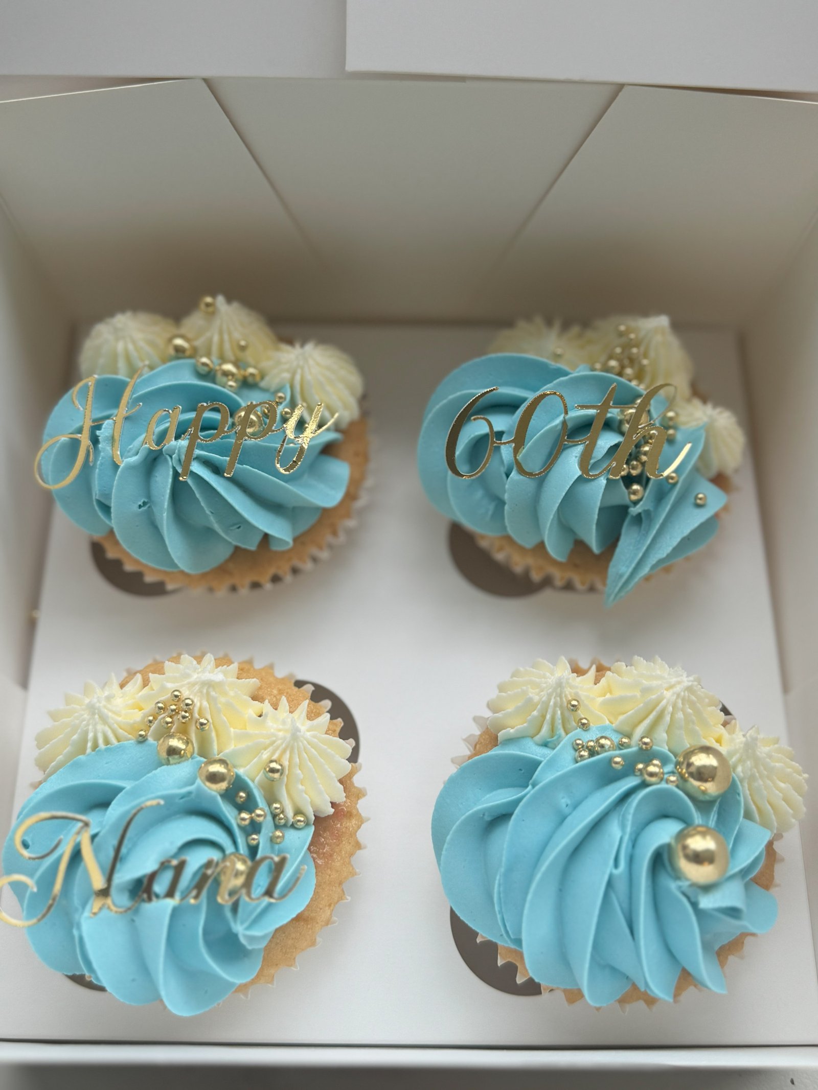 These Blue & Gold Birthday Cupcakes feature soft blue buttercream swirls paired with ivory piping, finished with elegant gold accents for a refined celebration look. Designed to feel modern yet timeless, they’re ideal for birthdays of any age and suit both intimate gatherings and larger celebrations. Each cupcake is carefully finished by hand to ensure a polished, cohesive presentation across the box.