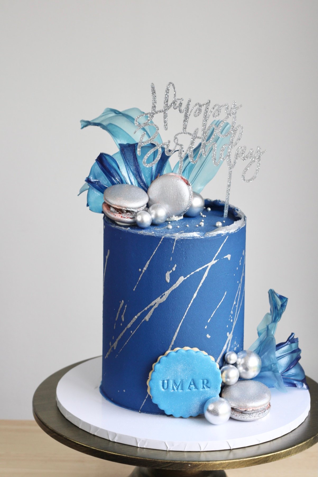 Make a bold statement with our Blue & Silver Luxe Cake. This elegant single-tiered cake features a deep blue buttercream base with artistic silver brushstroke accents for a modern, sleek look. Topped with shimmering silver macarons (contain nuts), decorative pearls, and handcrafted rice paper sails, this cake exudes sophistication. Available in a variety of delectable flavours, this cake is ideal for stylish celebrations.