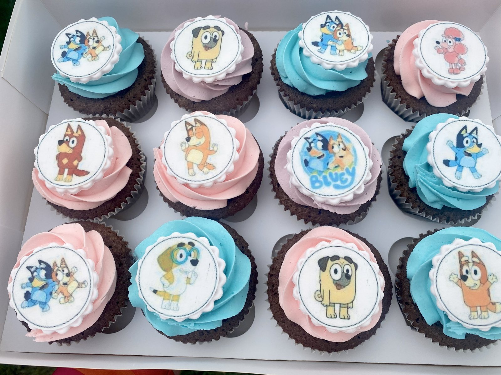 These Bluey cupcakes are decorated with soft pastel buttercream swirls and finished with edible character toppers featuring Bluey, Bingo, and friends. Bright, playful, and instantly recognisable, they’re a perfect choice for a Bluey-themed birthday celebration and can be enjoyed as part of a coordinated party table or as a standalone treat.