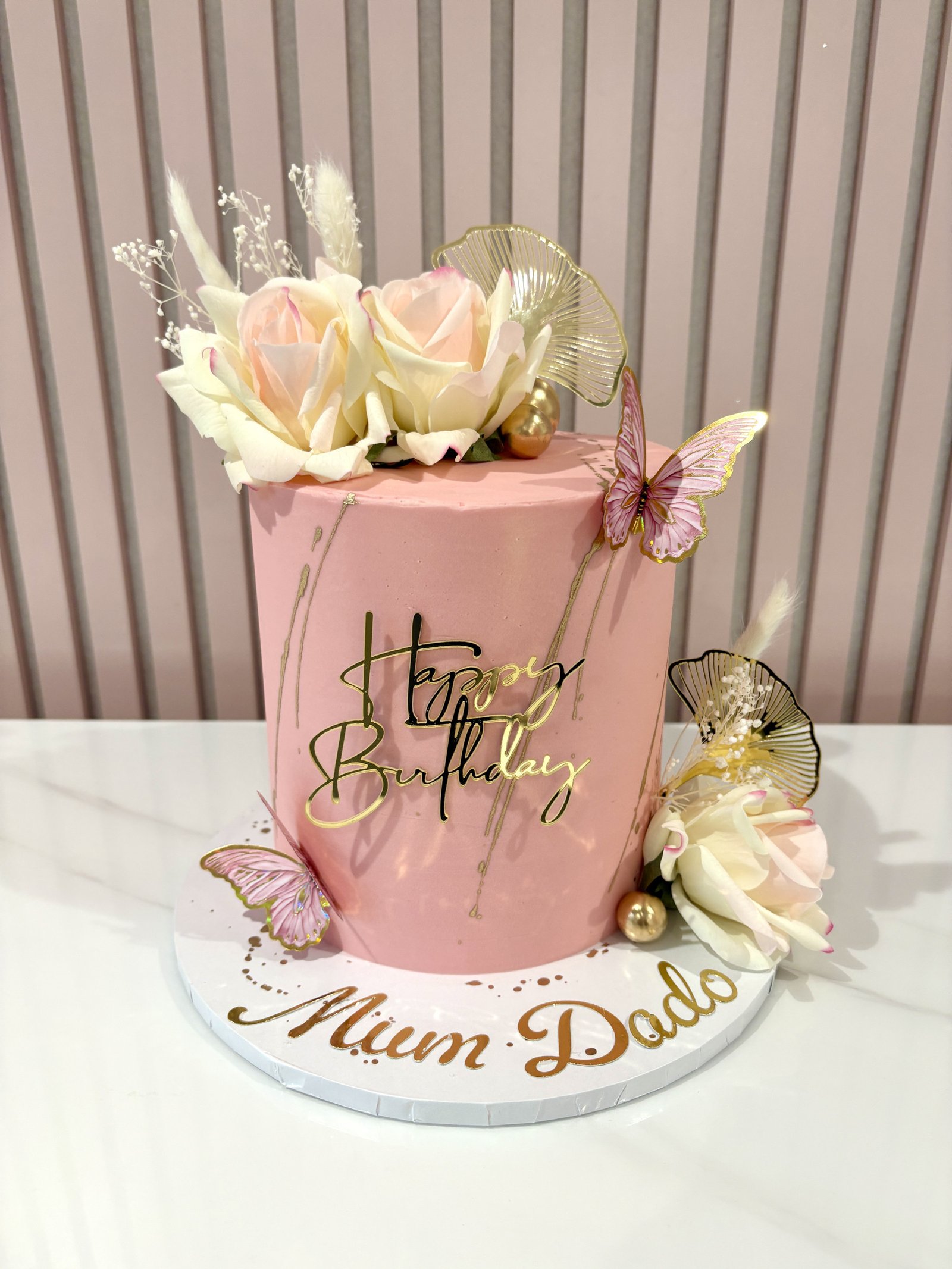 A refined blush pink buttercream cake adorned with delicate gold detailing, statement roses and elegant butterfly accents. Finished with soft botanical touches and a sleek gold script topper, this design feels graceful, feminine and beautifully balanced. Perfect for birthdays that call for something timeless, polished and effortlessly luxurious.