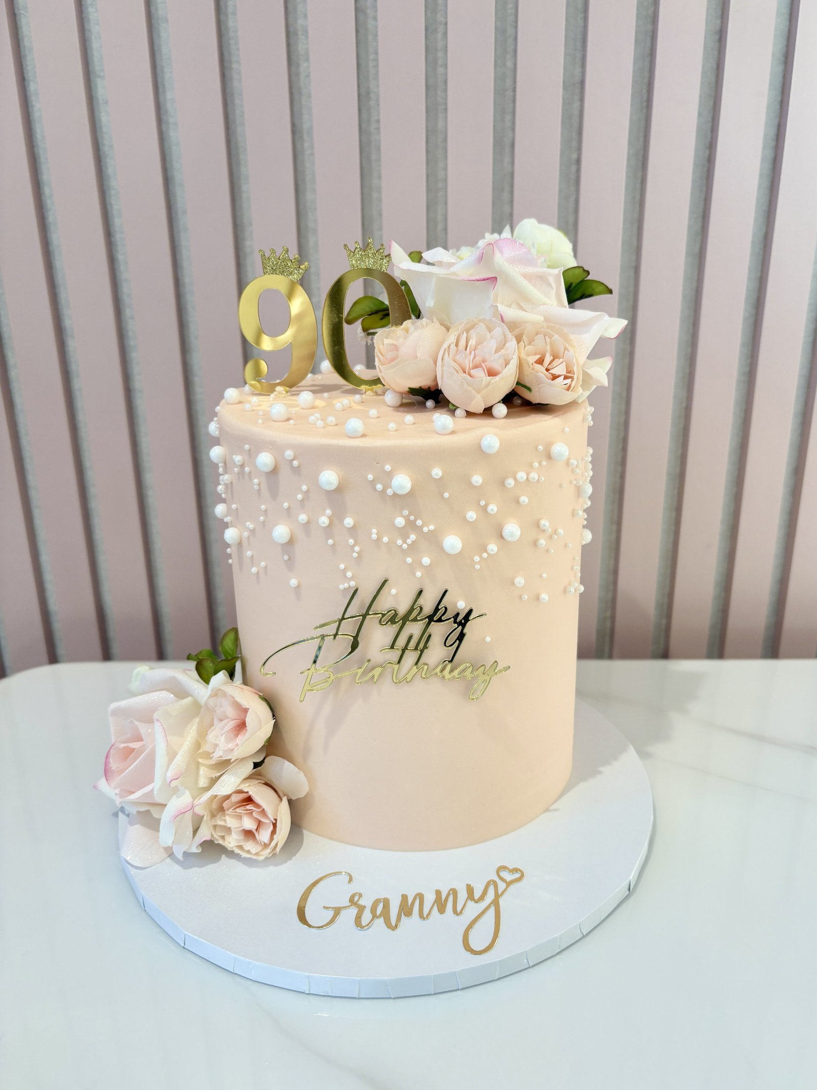 A beautifully refined celebration cake finished in smooth blush buttercream and adorned with cascading sugar pearls for a soft, elegant shimmer. Topped with delicate artificial roses and a gold age topper, this design balances simplicity with luxury, making it perfect for birthdays that deserve something timeless and sophisticated.