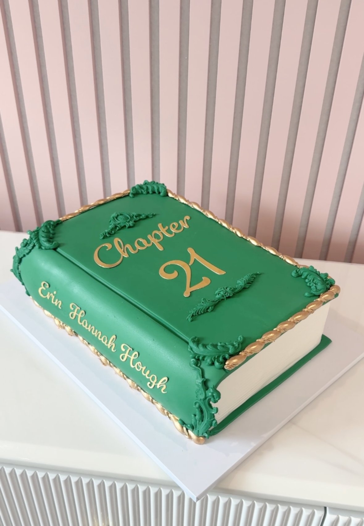Celebrate a new chapter in style with this elegant book-shaped cake. Covered in rich emerald green icing with ornate gold detailing, it’s designed to resemble a classic hardcover book. Ideal for birthdays or any meaningful milestone, it can be customised with any age or name on the spine and cover.