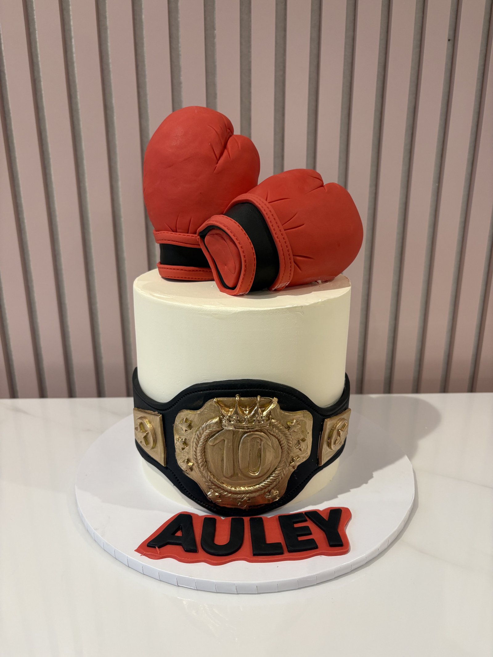 A bold and powerful design, this boxing-themed cake is finished with a smooth ivory base, detailed championship belt wrapping around the tier, and handcrafted red boxing gloves taking centre stage on top. The gold belt features intricate detailing with a prominent number centre plate, creating a striking focal point that celebrates a true champion. Strong, clean lines and carefully sculpted elements give this cake an impressive presence, making it perfect for boxing fans, fighters, and anyone ready to celebrate like a title holder.