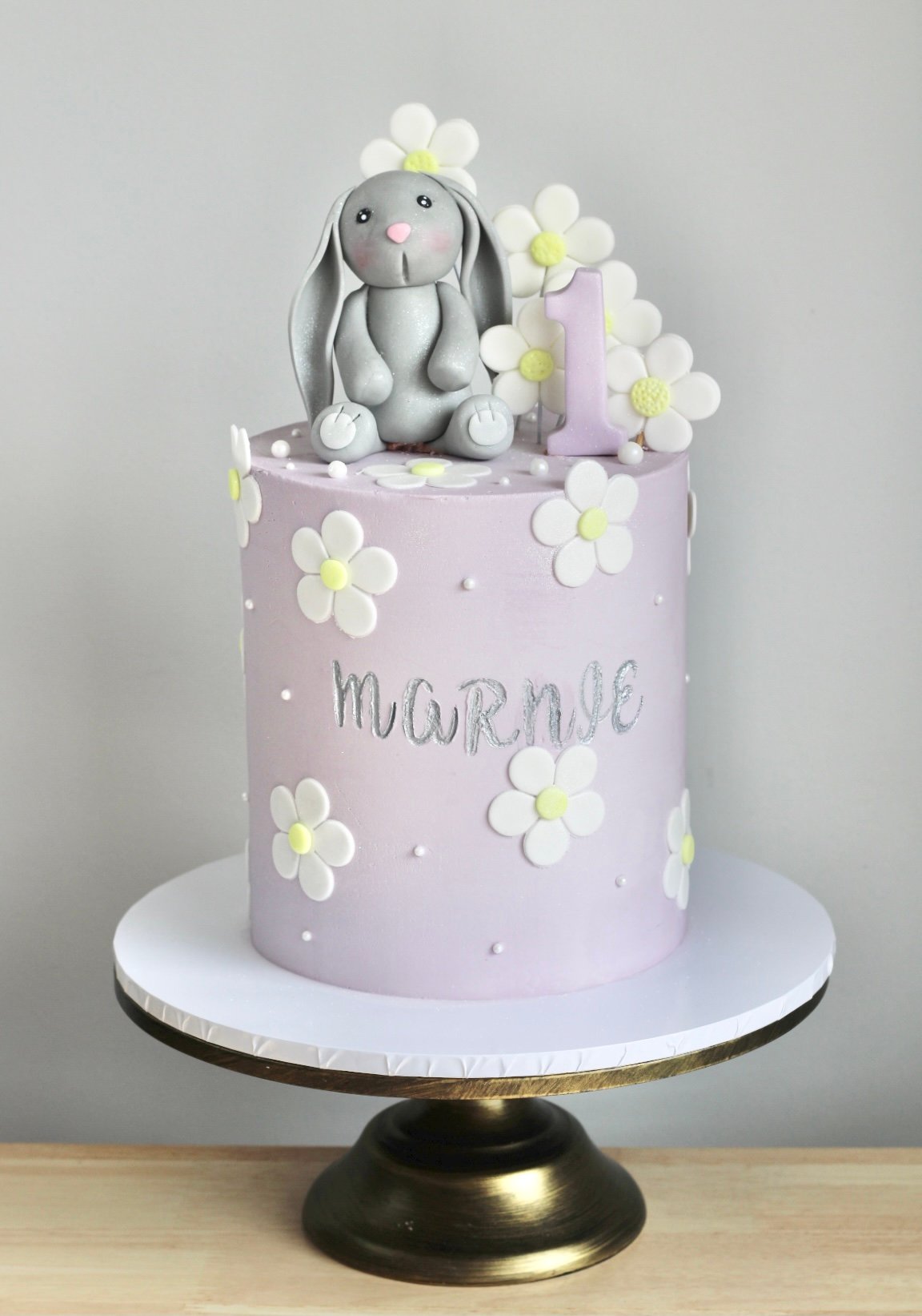 This charming Bunny & Daisy Cake is the perfect choice for a first birthday or any sweet celebration. Featuring a soft pastel lilac base adorned with delicate sugar daisies, it’s topped with an adorable handcrafted bunny figurine, making it as cute as it is delicious. The subtle shimmer and elegant detailing create a beautifully whimsical centrepiece that’s sure to impress.