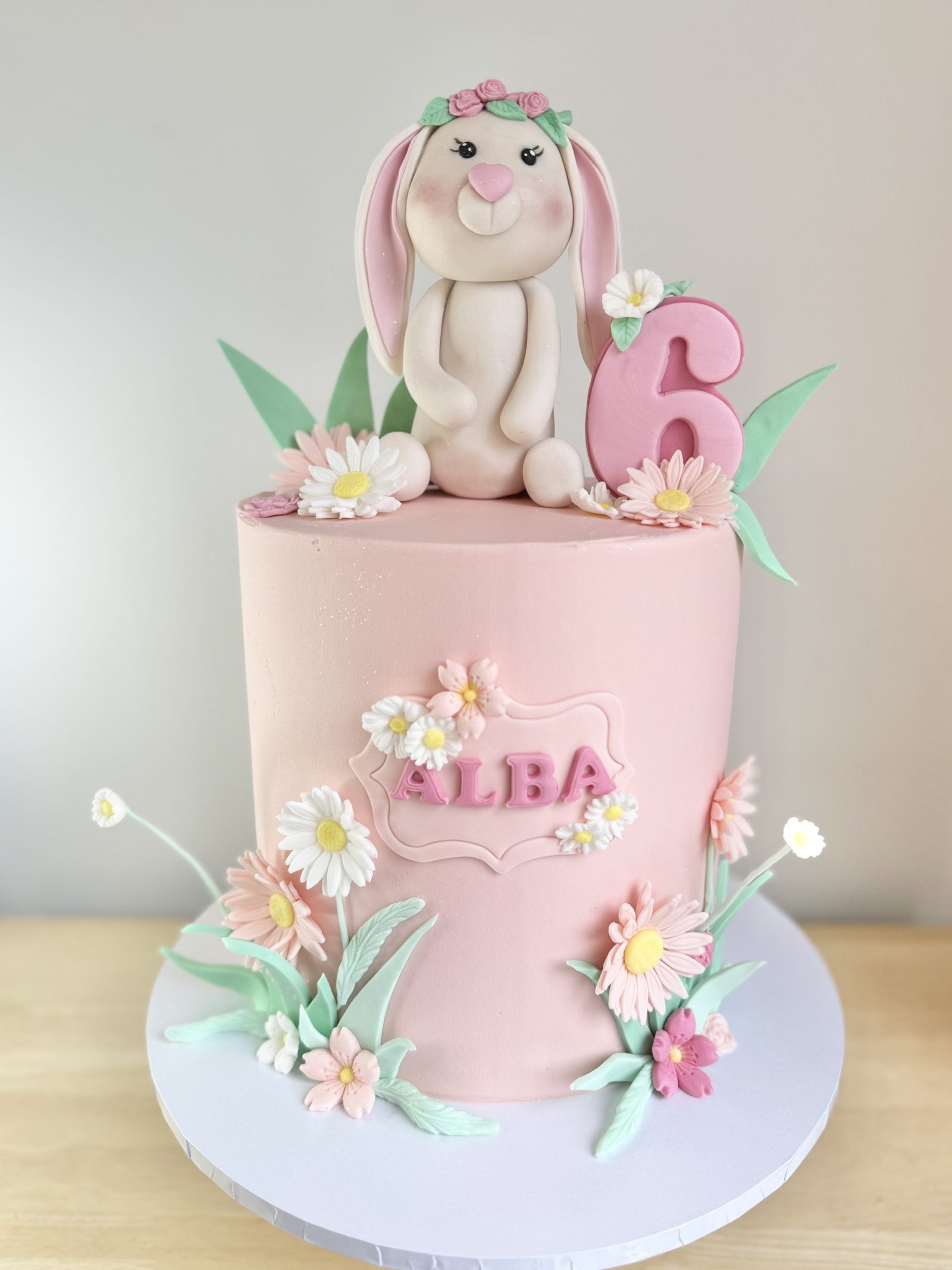 This Bunny & Daisy Cake is a delightful creation perfect for a springtime birthday or any special occasion. This pastel pink cake is topped with an adorable handcrafted bunny, complete with long floppy ears, a floral headband, and a sweet smile. Surrounding the bunny, delicate sugar daisies and greenery bring a fresh, garden-inspired charm to the design. This beautifully decorated cake is a wonderful choice for any bunny lover or nature-themed celebration.