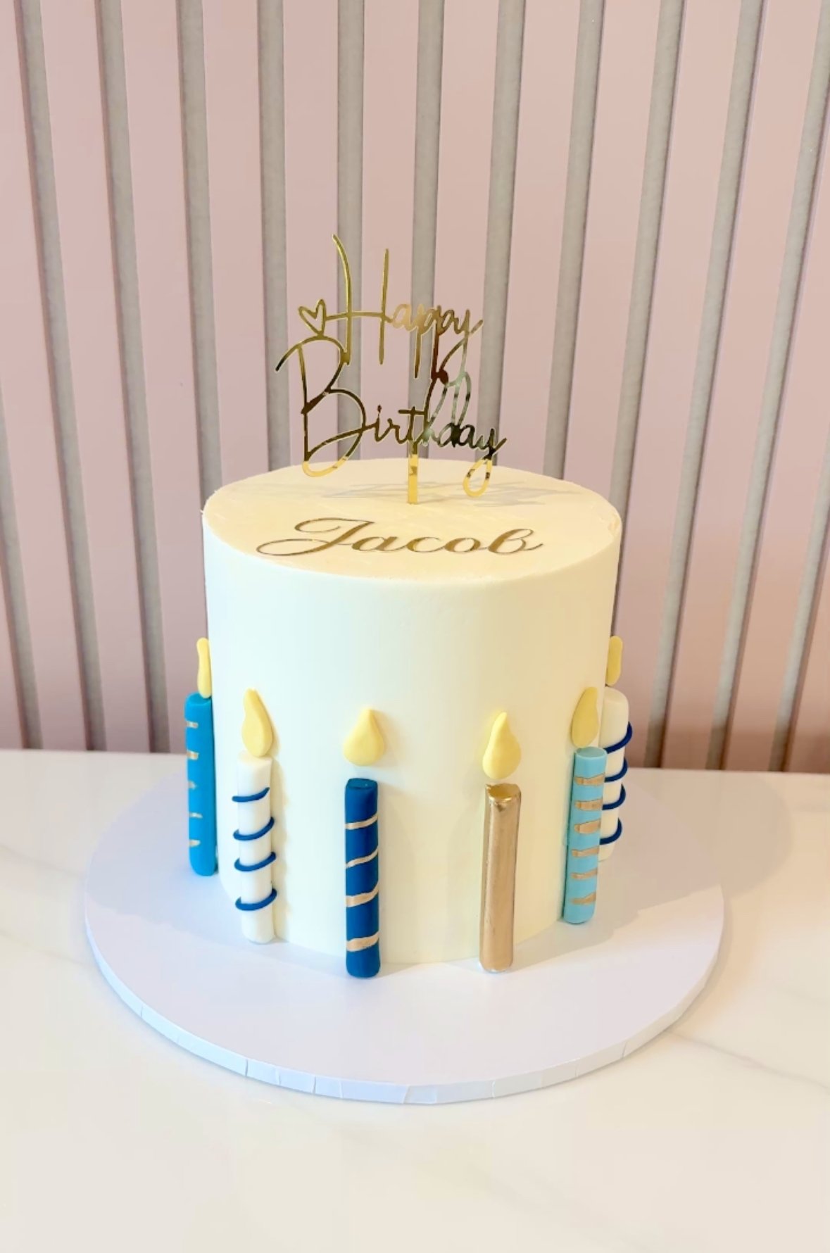 A simple yet striking cake, decorated with tall edible candles in shades of blue, white, and gold. Perfect for birthdays of any age, this design adds a modern twist to a classic celebration theme.