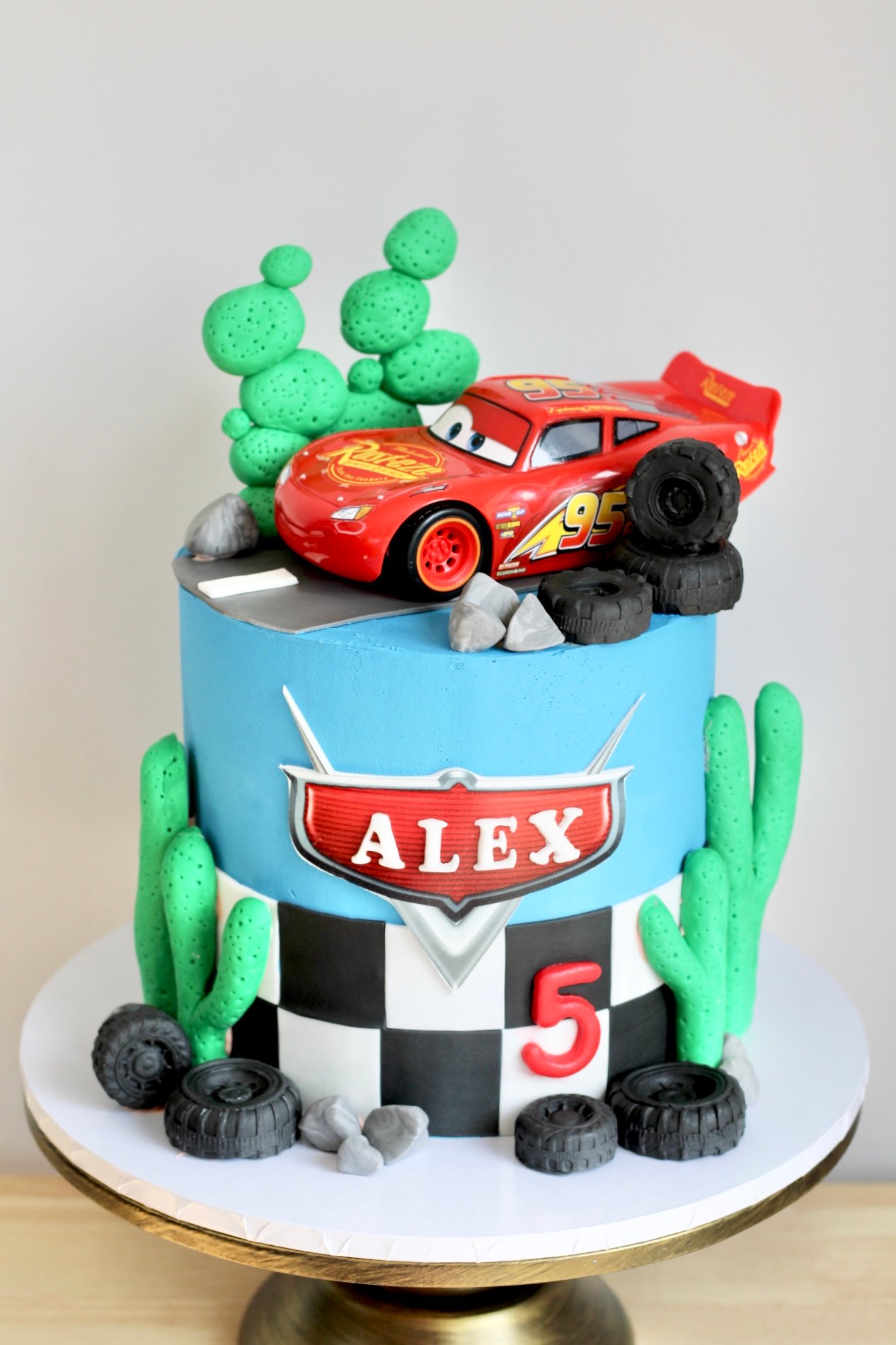Rev up the fun with this thrilling Cars-themed cake, perfect for any young racing fan. Designed with a classic race track setting, this cake features checkered flag details, edible cacti, and rocky terrain, all leading to the star of the show—Lightning McQueen. The vibrant blue and red colour scheme, combined with realistic tyre decorations, creates a dynamic and exciting design. A must-have for any Cars enthusiast, this cake can be customised with a name and age for a truly personal touch.