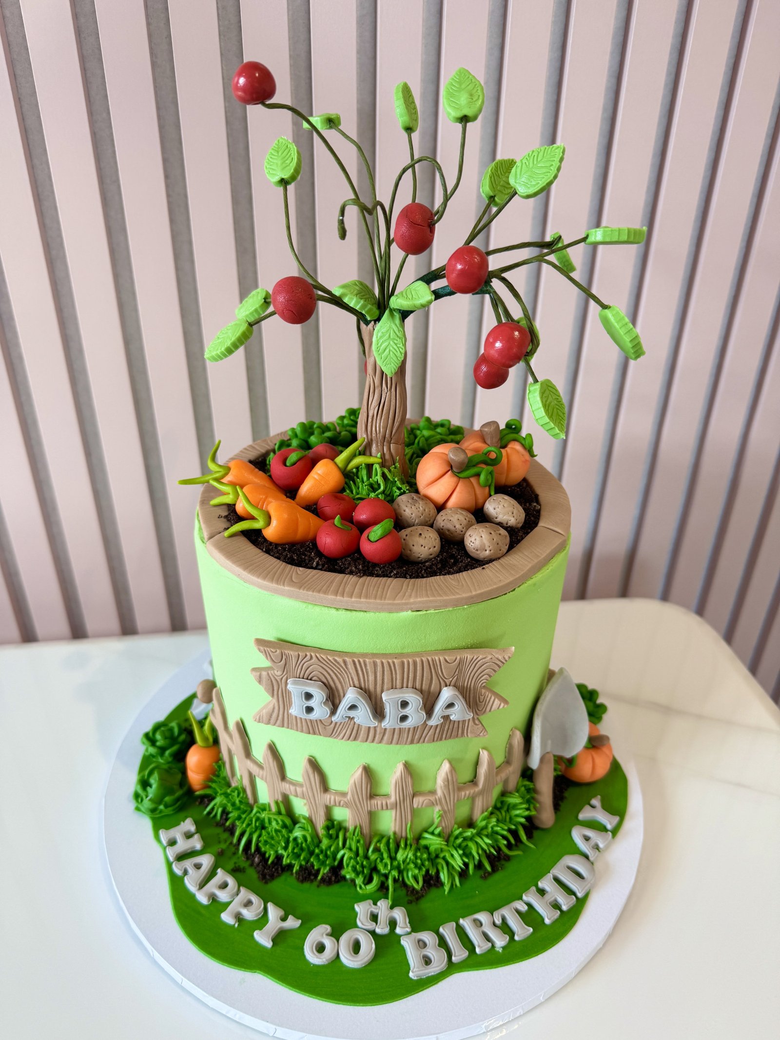 A charming garden-inspired cake topped with a handcrafted cherry tree, complete with delicate leaves and bright red cherries. The flowerpot-style design is finished with wood-effect detailing, edible “soil”, handcrafted vegetables and a rustic fence, creating a delightful allotment scene that’s perfect for a keen gardener celebrating a special birthday.