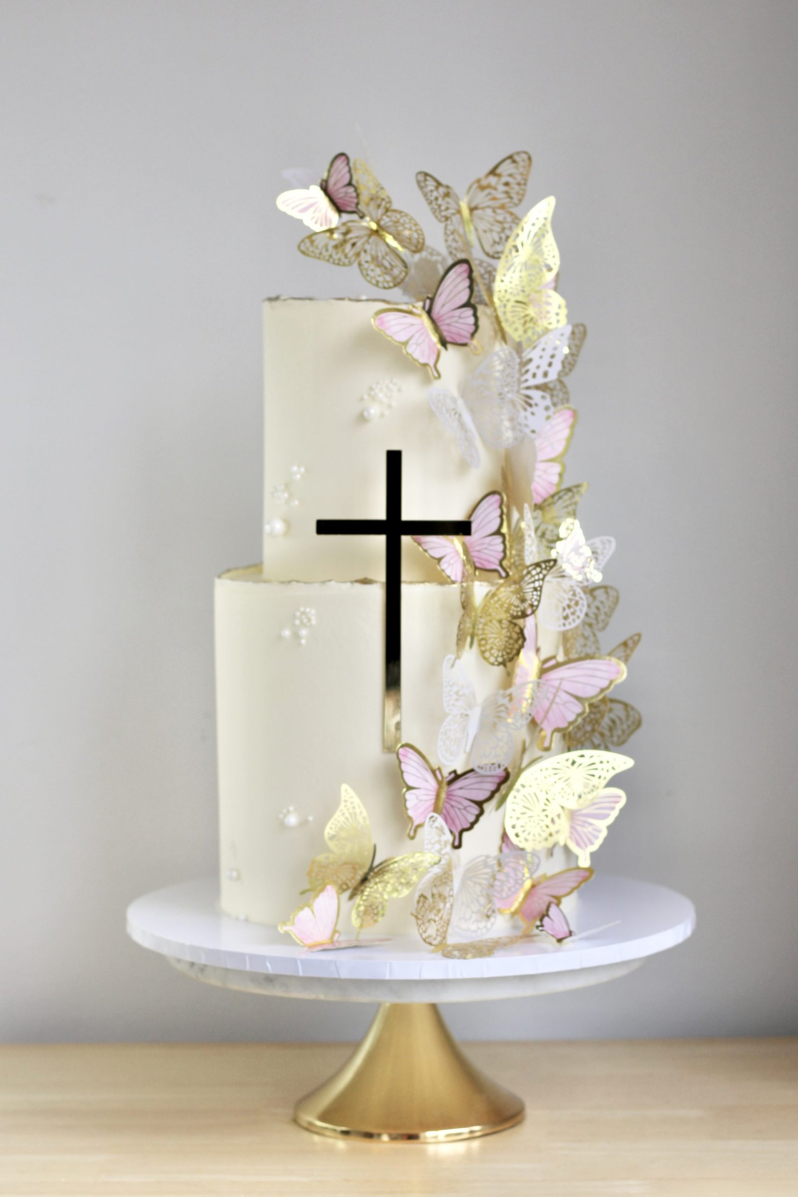 A breathtakingly elegant two-tier Christening cake adorned with delicate pink and gold butterflies, symbolising purity and new beginnings. The smooth ivory buttercream finish is accented with lustrous edible pearls and a striking gold cross at its centre, creating a stunning focal point. Perfect for a special baptism or Christening celebration, this luxurious design beautifully captures the essence of faith and grace.