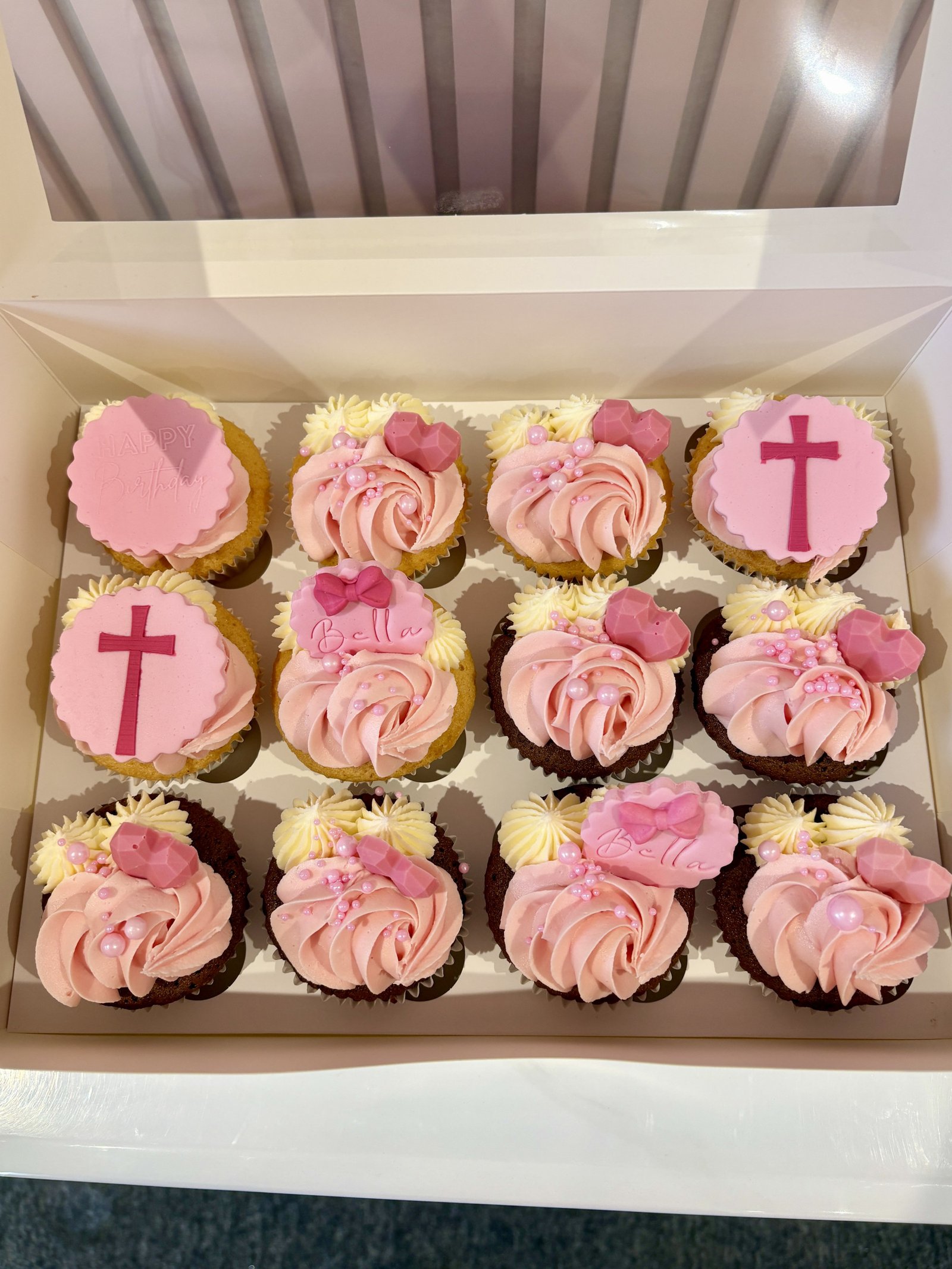 A beautifully coordinated box of christening cupcakes, decorated with soft pink buttercream swirls and elegant ivory piping. The cupcakes are finished with a mix of delicate religious plaques, crosses, bows, pearl details and geometric heart accents, creating a refined and meaningful design. Presented exactly as shown, these cupcakes offer a thoughtful and stylish way to celebrate a christening or baptism.