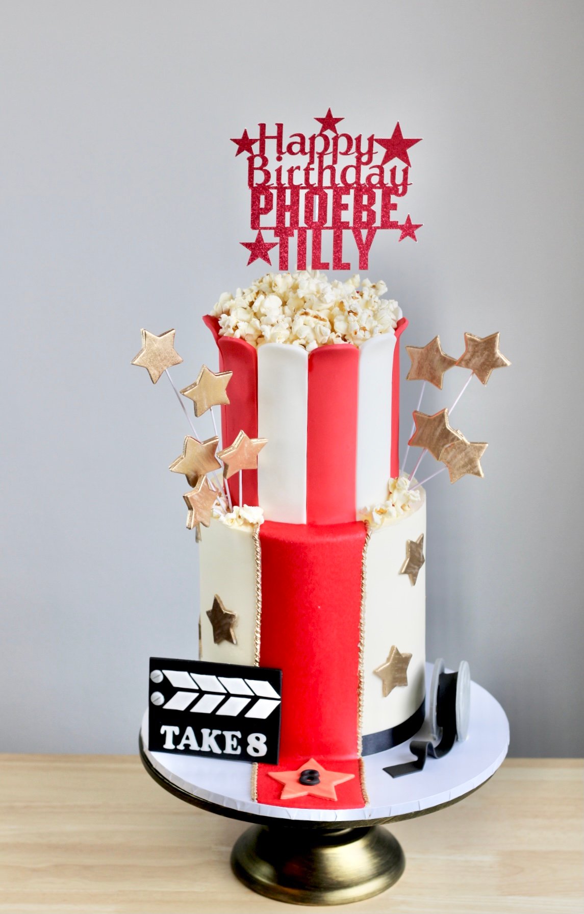 Lights, camera, action! Make your little star’s birthday a red-carpet event with this dazzling Movie-themed cake. Designed for young movie lovers, this showstopping two-tier cake features a bold red and white popcorn tub, a shimmering red carpet, and golden star decorations fit for a superstar. Topped with a fun popcorn effect and a personalised film-themed topper, it’s the perfect centrepiece for a cinema-themed birthday party.