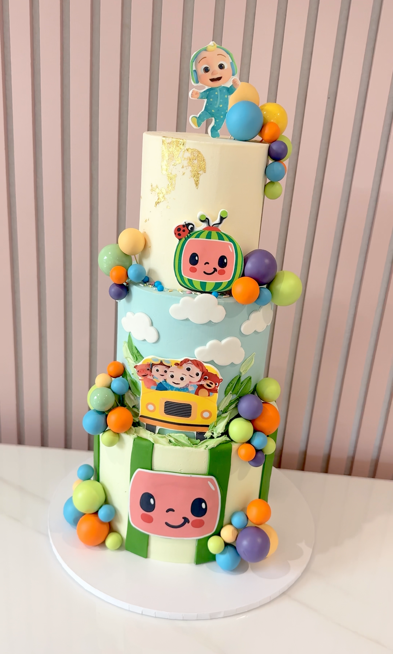 This vibrant three-tier Cocomelon cake is bursting with colour and joy, perfect for little fans of the popular show. Featuring favourite characters, the iconic watermelon TV face, the school bus, and playful clouds, it’s a cheerful design from top to bottom. Decorated with rainbow-hued spheres and green fondant stripes, this cake is sure to light up any birthday celebration. Customisable for any age and name.