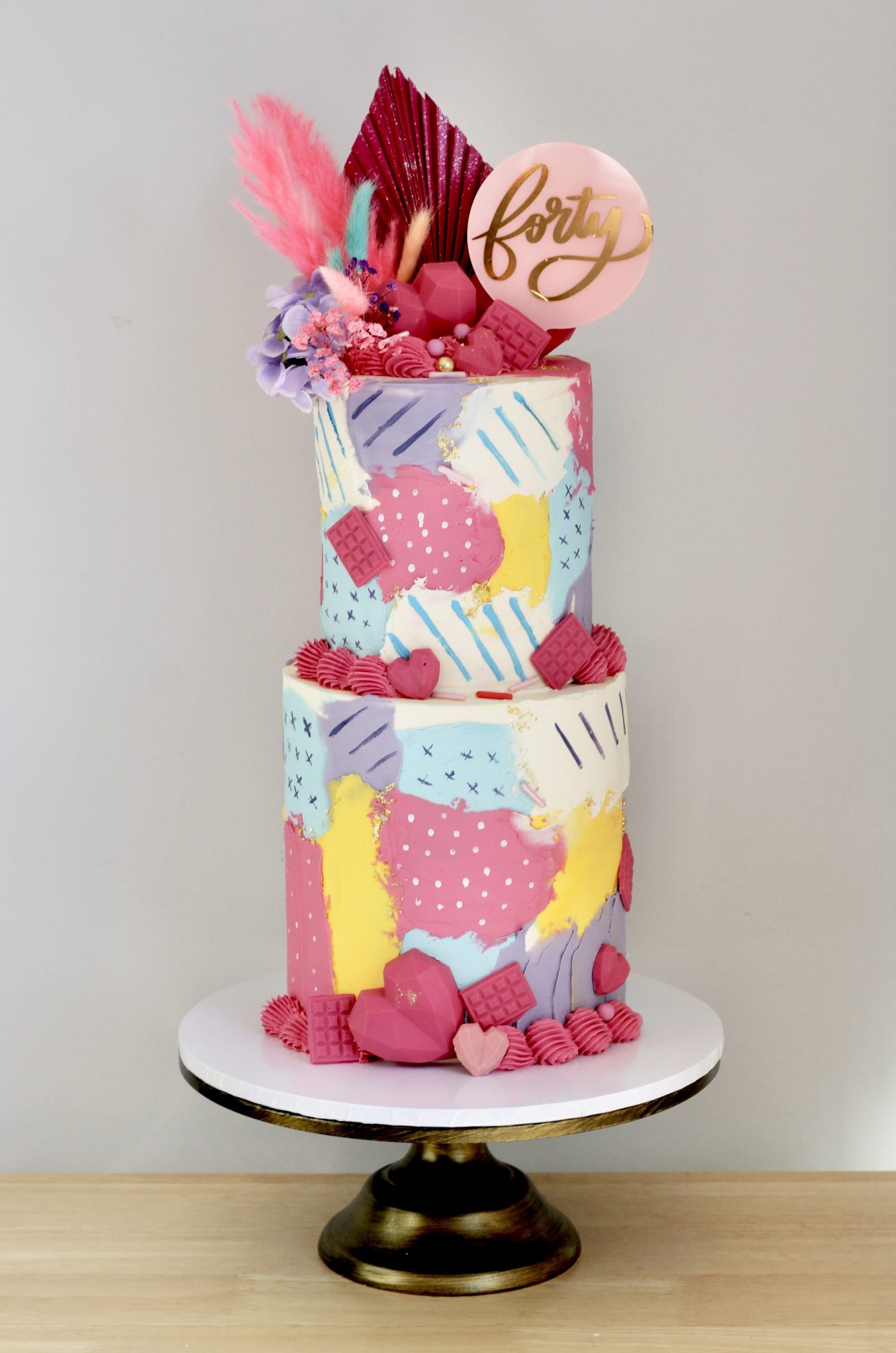 Make a bold statement with the Creative Canvas Cake a stunning two-tier masterpiece that bursts with colour and creativity. Adorned with an abstract buttercream design in lively pinks, blues, yellows, and purples, this cake is decorated with edible chocolate textures, piped details, and delicate floral embellishments. Finished with a striking arrangement of dried flowers it’s the perfect centrepiece for birthdays and special celebrations.