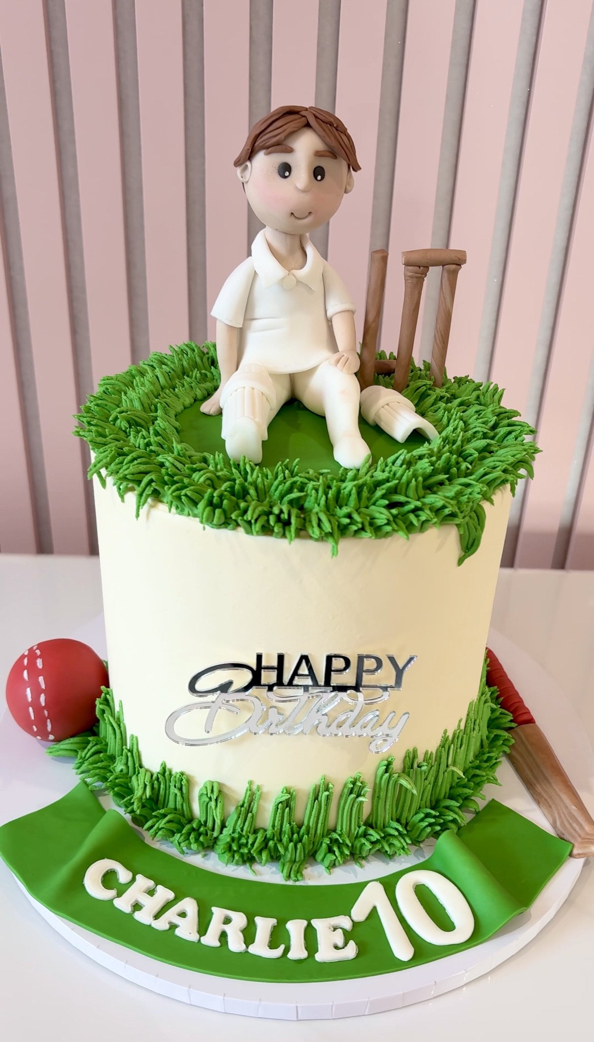 A timeless design for cricket lovers of all ages, this elegant cake features a handcrafted cricketer dressed in classic whites, seated on a textured buttercream “grass” finish with detailed stumps and bat to complete the scene. The clean ivory base keeps the look refined and versatile, making it equally suited to boys, teens, and adult cricket fans alike. Thoughtfully finished with layered piping for realistic turf effect and a sleek message topper, this cake is perfect for celebrating anyone whose heart belongs on the pitch.