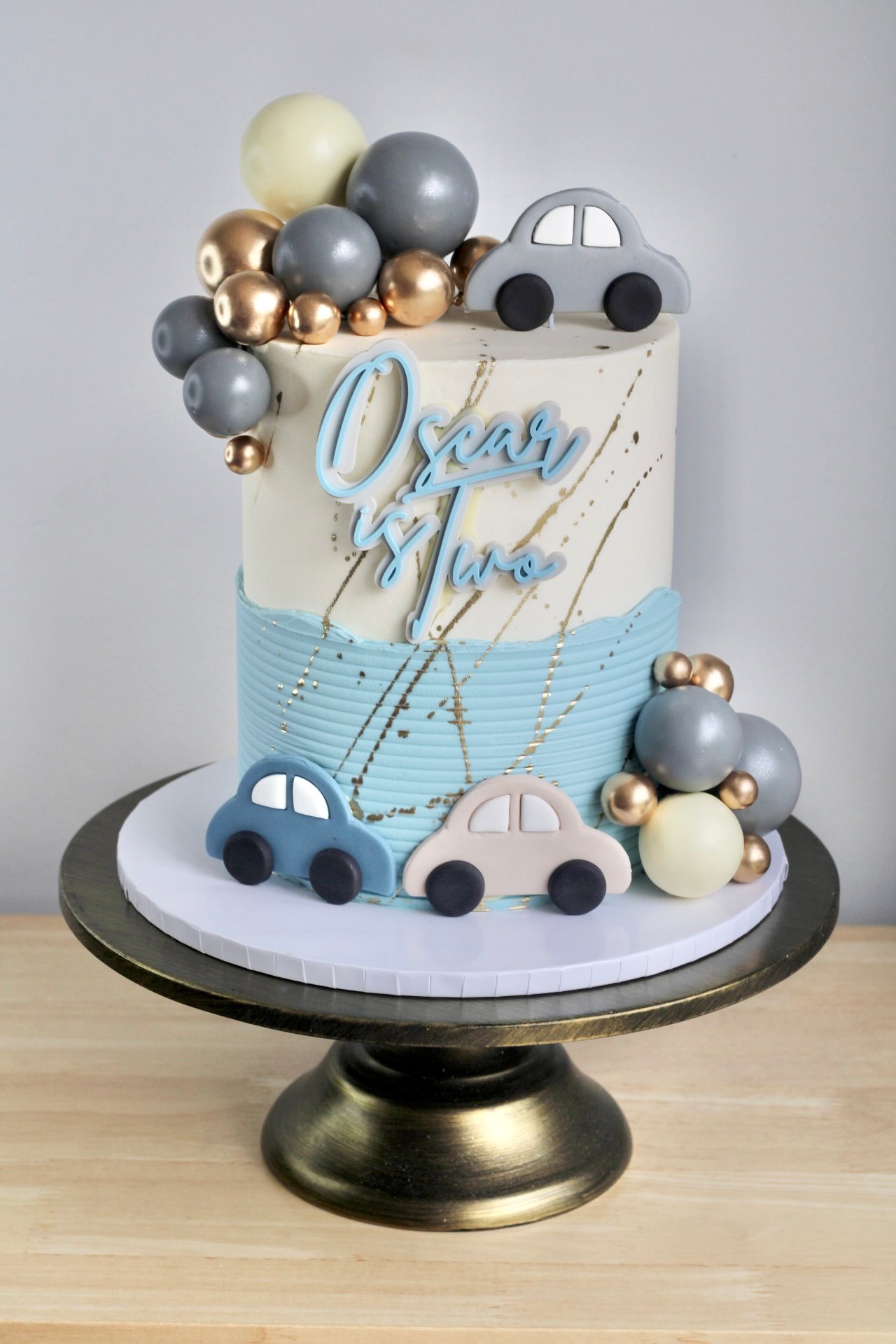 This adorable Cute Car Cake is the perfect centrepiece for a little one’s birthday celebration! Featuring a charming pastel colour palette with fondant cars, gold accents, and a touch of shimmer, this cake is both stylish and fun. The soft buttercream finish is complemented by balloon-like spheres and delicate detailing for a modern yet playful look. Ideal for young car enthusiasts, this cake is sure to make their special day extra memorable!