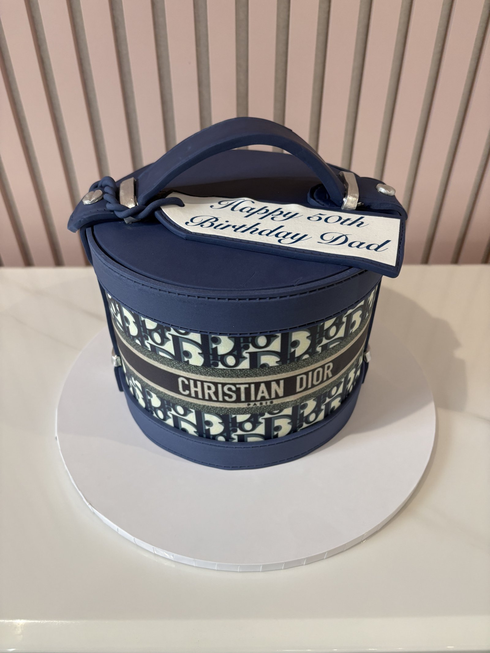 Our Dior Gentleman Case Cake is a refined, designer-inspired celebration cake styled to resemble a luxury travel case. Finished in deep navy tones with structured detailing and a signature-inspired panel, this statement design is completed with a sleek handle and polished metallic accents for a truly elevated look. Crafted with precision and clean lines, it’s the perfect centrepiece for milestone birthdays and stylish celebrations, bringing a sense of sophistication and modern luxury to any occasion.