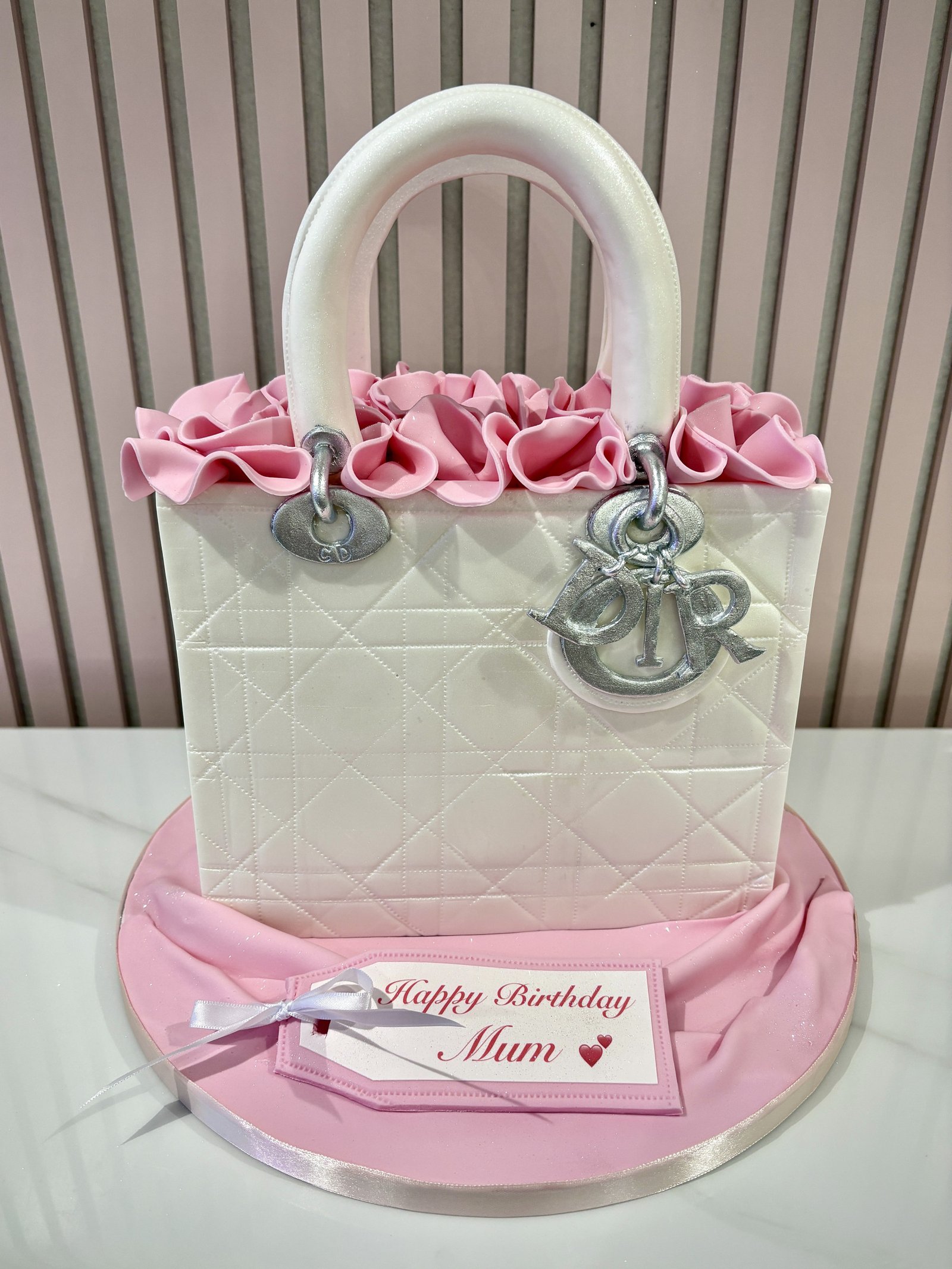 A striking Dior handbag cake inspired by the iconic designer style, complete with signature quilted detailing and statement Dior charm. Crafted in soft blush and ivory tones, this structured handbag design features realistic stitching, metallic-effect hardware and sculpted handles for an authentic high-fashion finish. Elegant and fashion-forward, it creates a sophisticated centrepiece for birthdays and stylish celebrations. The design can be customised in your preferred colour palette and personalised to suit the occasion while maintaining its unmistakable couture-inspired aesthetic.