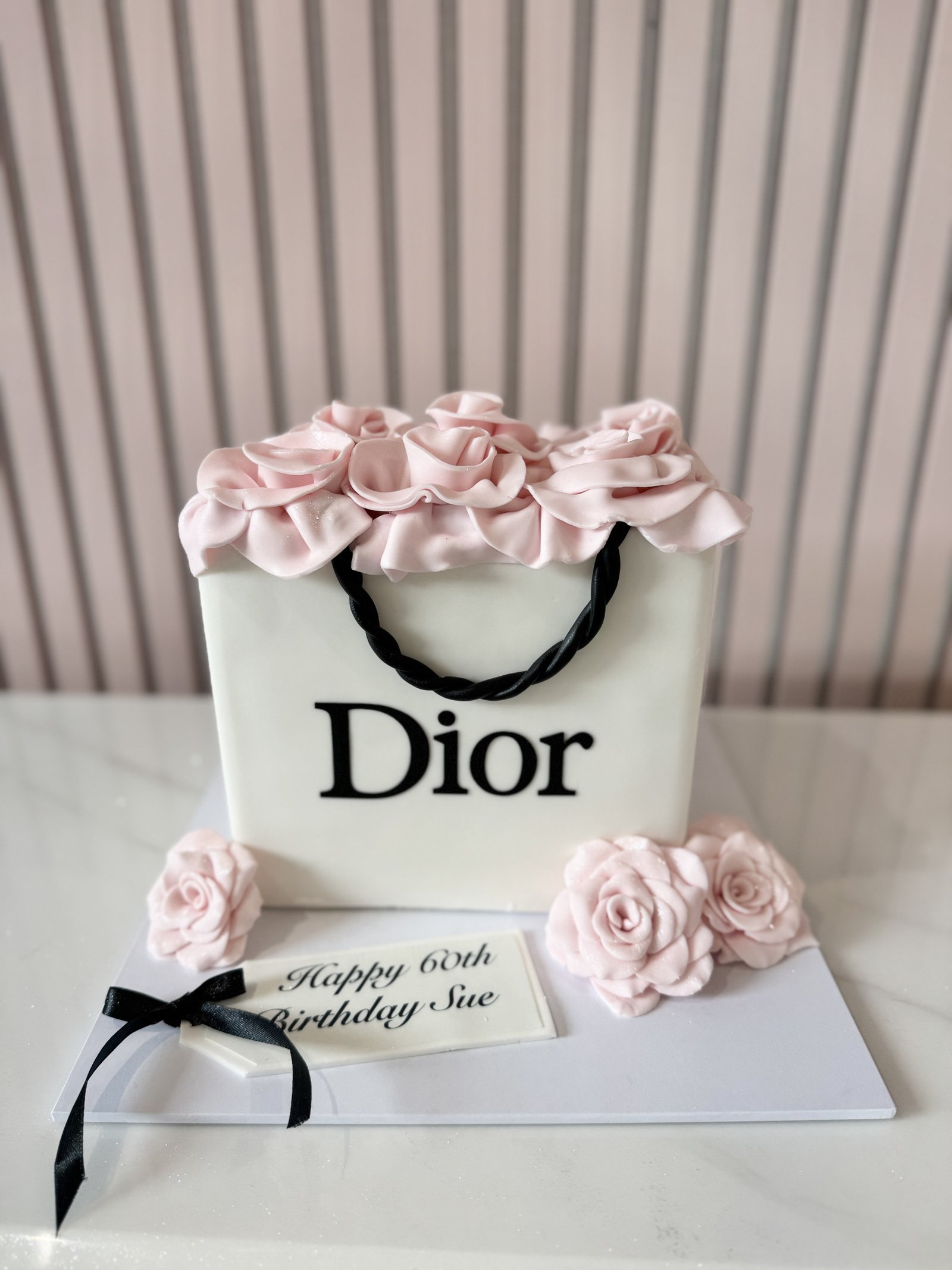 This elegant Dior-inspired cake is designed to resemble a luxury shopping bag, finished in crisp white with bold black detailing and soft blush sugar roses cascading across the top. The sculpted handle detail and delicate floral accents create a refined, high-end aesthetic, making it perfect for milestone birthdays and sophisticated celebrations. Clean, stylish, and beautifully balanced, this cake delivers a statement look while maintaining an understated luxury feel. The design can be customised with different ages, colour palettes, and personalised messages to suit the occasion.