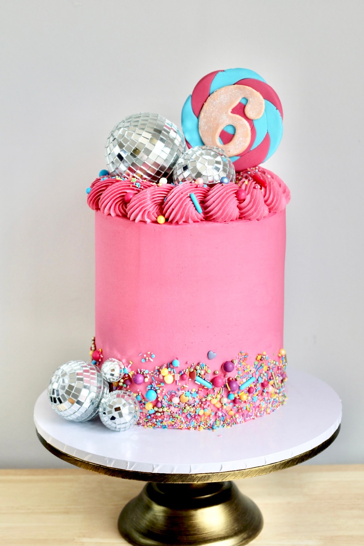 Get ready to dance the night away with this dazzling Disco Party Cake! Bursting with vibrant colours, sparkling edible sprinkles, and eye-catching disco ball decorations, this cake is perfect for little partygoers who love music and fun. Topped with a playful swirled lollipop number and a mix of large and small disco balls, this design brings a fabulous party vibe to any celebration. Whether it’s for a pop star in the making or a dance floor diva, this cake is the ultimate centrepiece for a high-energy birthday bash!