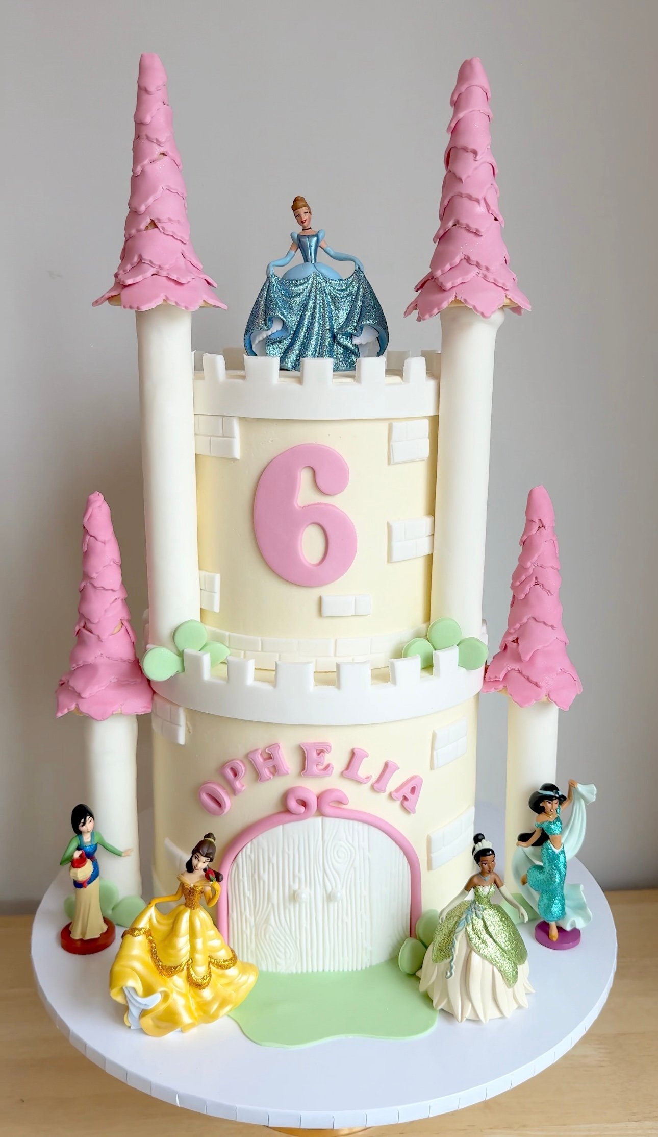 Step into a fairytale with this enchanting Disney Princess Cake. Designed like a magical castle, this stunning creation features elegant turrets topped with pink accents and beloved princess figurines, including Cinderella, Belle, Jasmine, Tiana, and Mulan. A dreamy choice for any young princess celebrating a special birthday