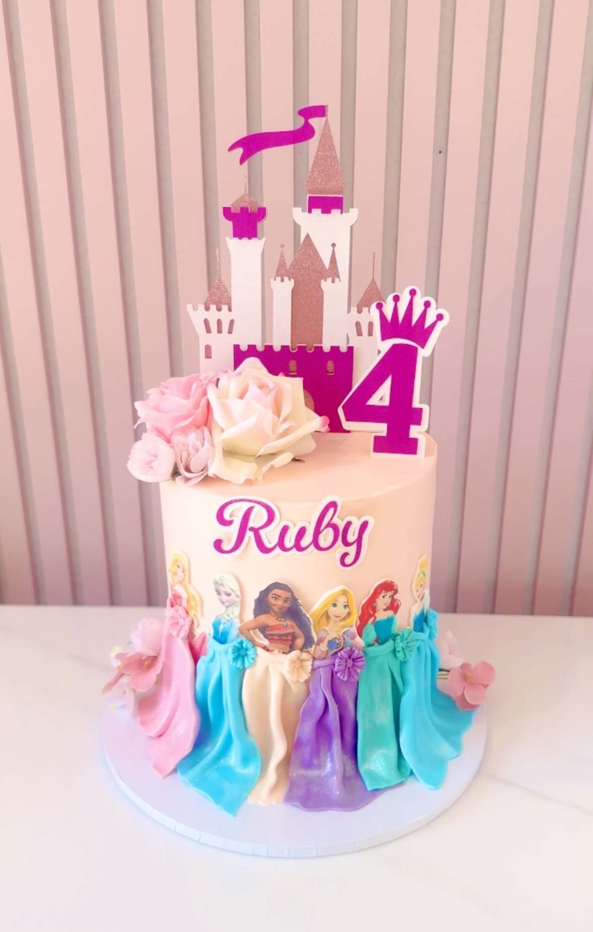 Every little princess’s dream come true! This enchanting cake features a regal pink castle topper, pastel blooms, and a lineup of beloved Disney princesses, each with a beautifully draped buttercream gown. A magical centrepiece for a fairytale birthday celebration.
