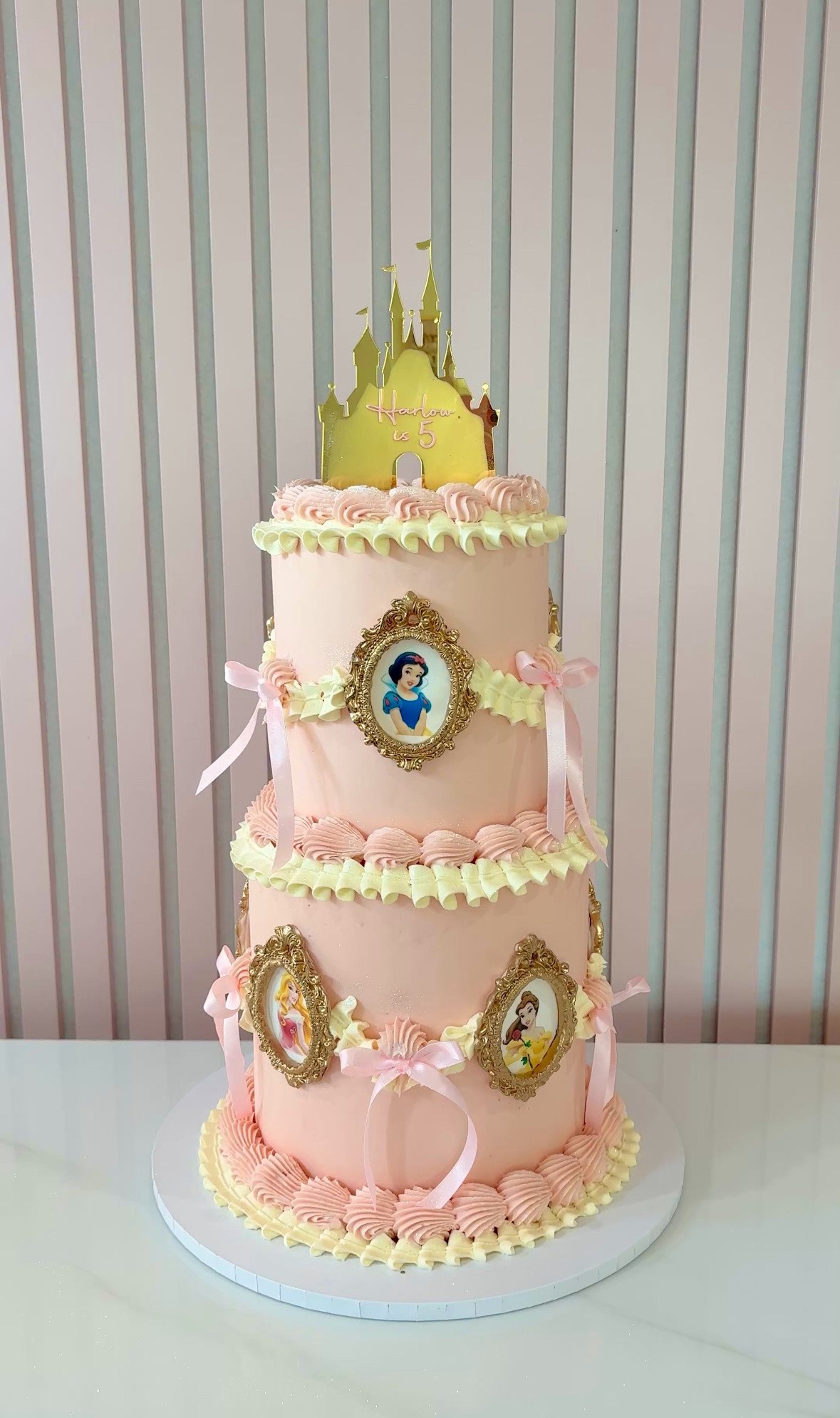 This elegant Disney Princess–inspired cake is a graceful two-tier design finished in soft blush and ivory tones with delicate piped detailing throughout. Decorated with ornate gold-style frames featuring beloved princess characters and finished with satin ribbon bows, the cake has a refined, storybook charm. A statement castle topper crowns the design, adding a magical finishing touch and creating a truly regal centrepiece. Perfect for little fans of Disney Princess, this cake blends classic fairytale elegance with beautifully balanced pastel tones.