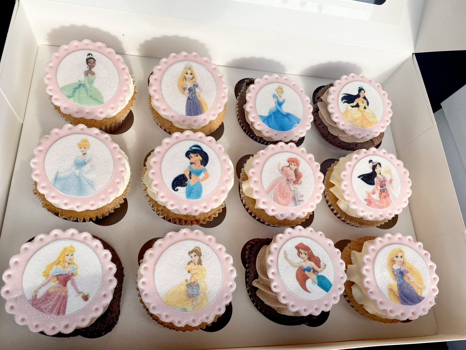 A charming box of cupcakes topped with edible Disney Princess designs, finished with soft pink fondant plaques and delicate detailing. Each cupcake is carefully decorated to create a cohesive, elegant look that feels playful yet refined, making them a beautiful choice for children’s celebrations and themed parties. The cupcakes are presented as a mixed set, featuring a variety of beloved princess illustrations, just as shown.