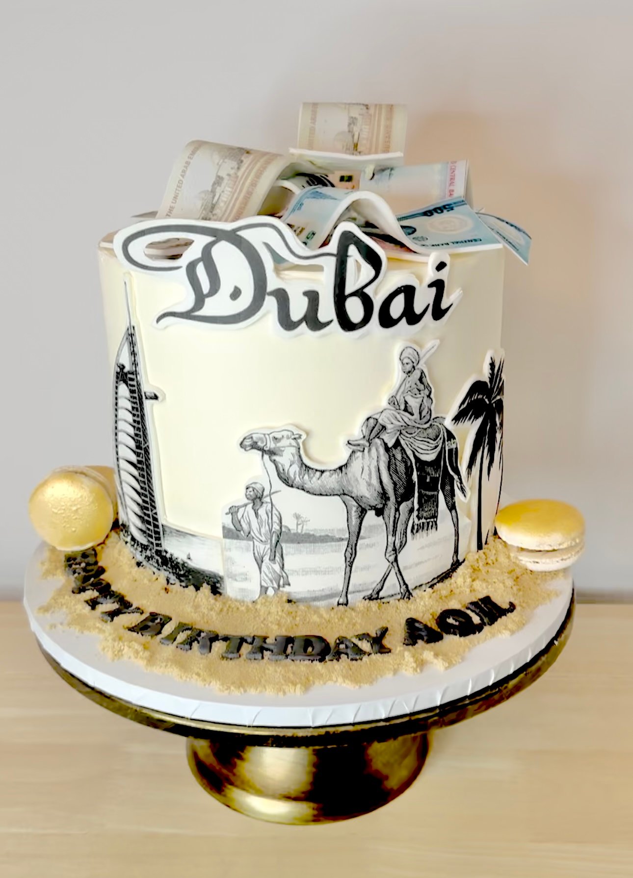Experience the luxury and culture of the UAE with the Dubai Dreams Cake, a stunning tribute to the City of Gold. Featuring edible artwork of Dubai’s iconic skyline, desert camels, and palm trees, this cake blends tradition with modern elegance. Topped with edible banknotes, golden accents, and a sandy-textured base with macarons (contain nuts), it’s perfect for those who love Dubai’s opulence and heritage.