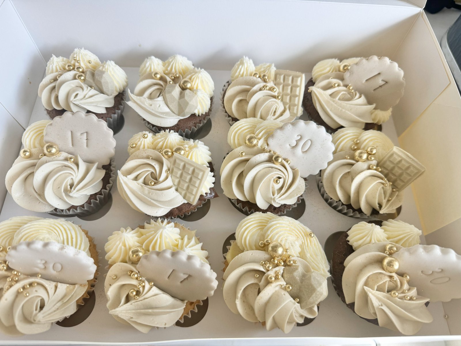 A refined set of birthday cupcakes finished in soft neutral tones, with smooth buttercream swirls, delicate gold accents, and iced number plaques. Designed to feel elegant and understated, these cupcakes are ideal for milestone and non-milestone birthdays alike, with the age customisable to suit any celebration while maintaining a timeless, luxury finish.