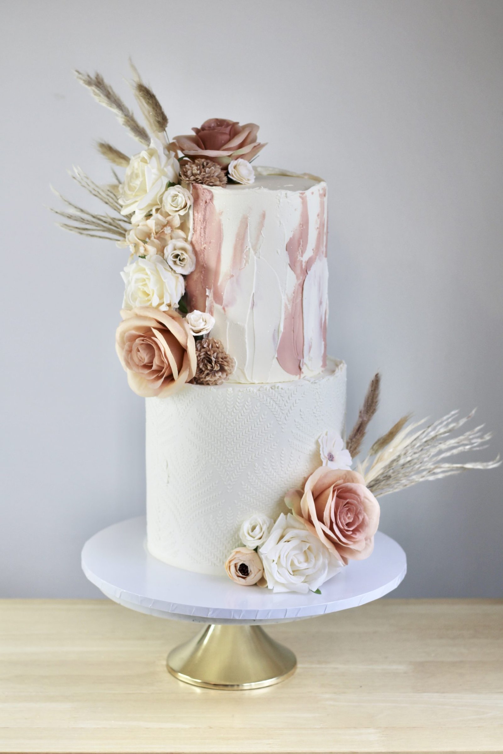 A stunning two-tiered cake that exudes elegance and natural beauty. This masterpiece features a textured ivory base with intricate detailing, complemented by a soft blush marbled top tier. Adorned with artificial roses, dried foliage, and delicate pampas grass, this cake brings a graceful and timeless aesthetic. Finished with subtle gold accents, it’s the perfect choice for those who appreciate understated luxury.