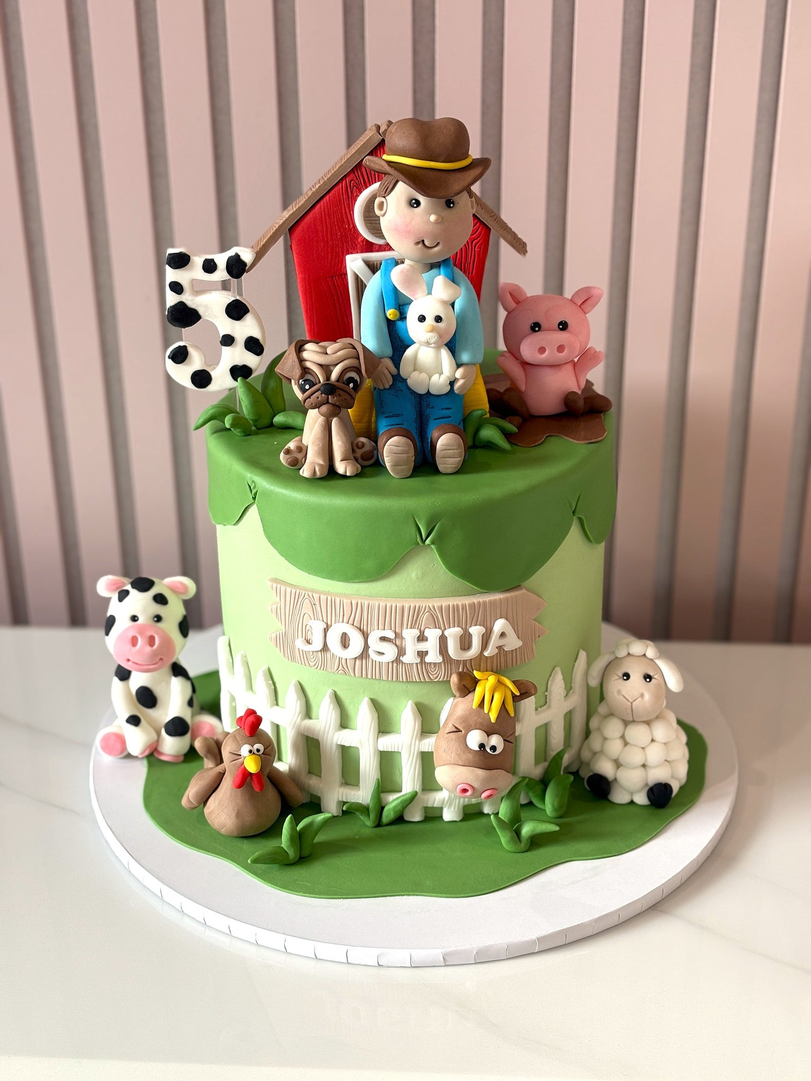 This delightful farm-themed cake is a charming single-tier design, perfect for a little one’s birthday celebration. Decorated in fresh green tones with a white picket fence detail, the cake features handcrafted fondant farm animals including a cow, sheep, pig, chicken, horse, and an adorable farmer character topper seated in front of a barn backdrop. The playful number detail and personalised name plaque complete the countryside scene, creating a warm, joyful centrepiece full of character.