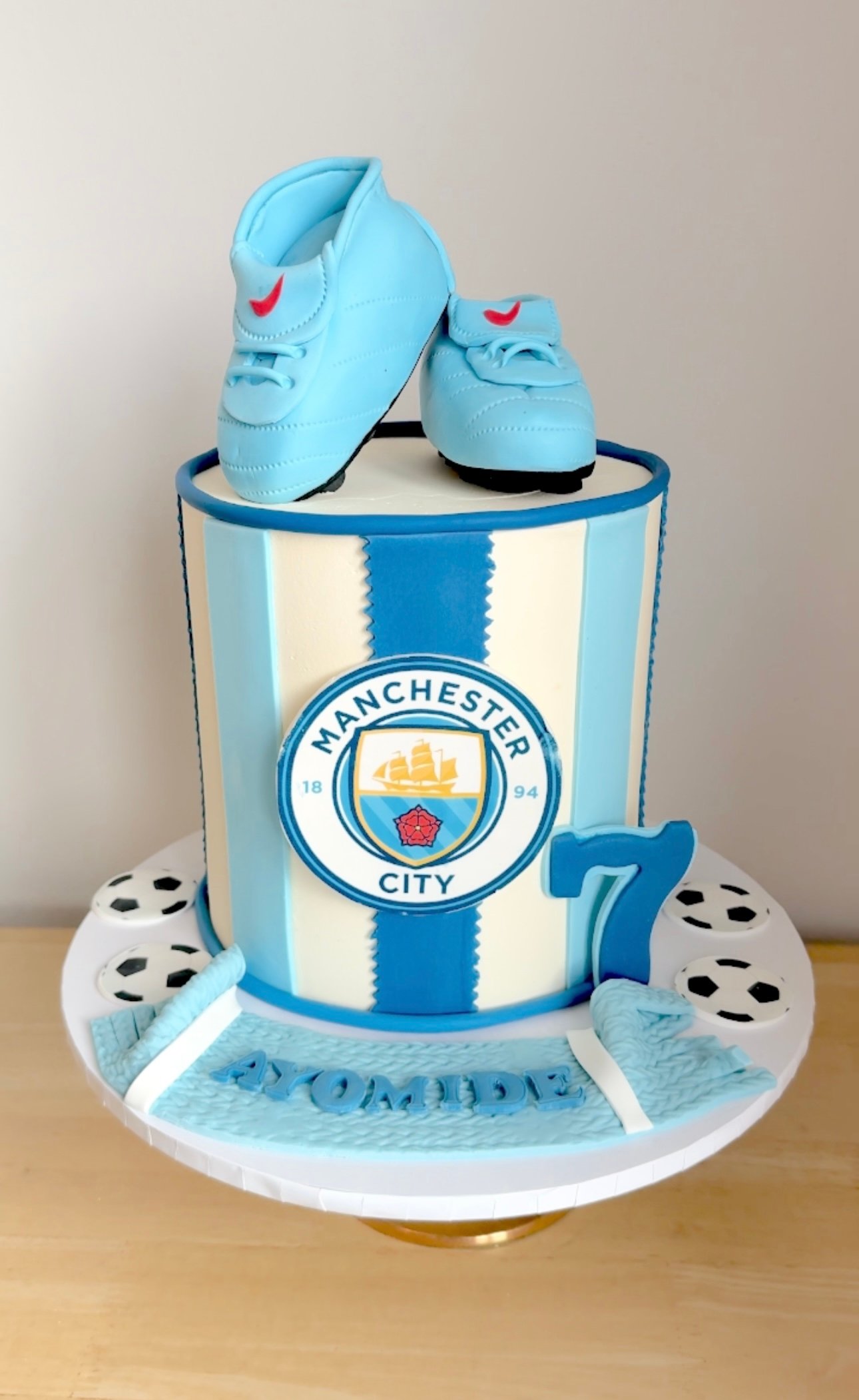 Kick off the celebration with this incredible football-themed cake, featuring a bold striped design, a detailed team emblem, and a pair of edible fondant football boots sitting proudly on top. Complete with a fondant scarf, football decorations, and a jersey-style number, this cake is the ultimate treat for any football fan. It can be customised to represent any football team, making it the perfect centrepiece for a birthday.