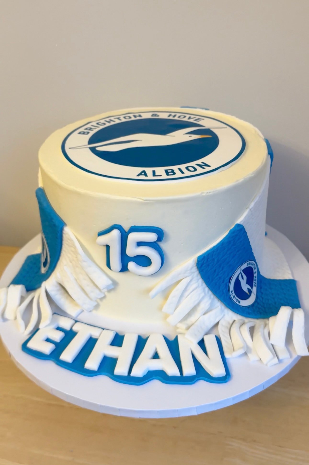 A dream cake for any football fan! This stylish single-tier cake is decorated in the colours and emblem of your favourite football team, complete with a fondant scarf draped around the sides for a truly sporty finish. Whether you’re celebrating a birthday or a special match day, this cake is a winning choice. It can be customised to represent any football team, making it the perfect treat for passionate supporters.