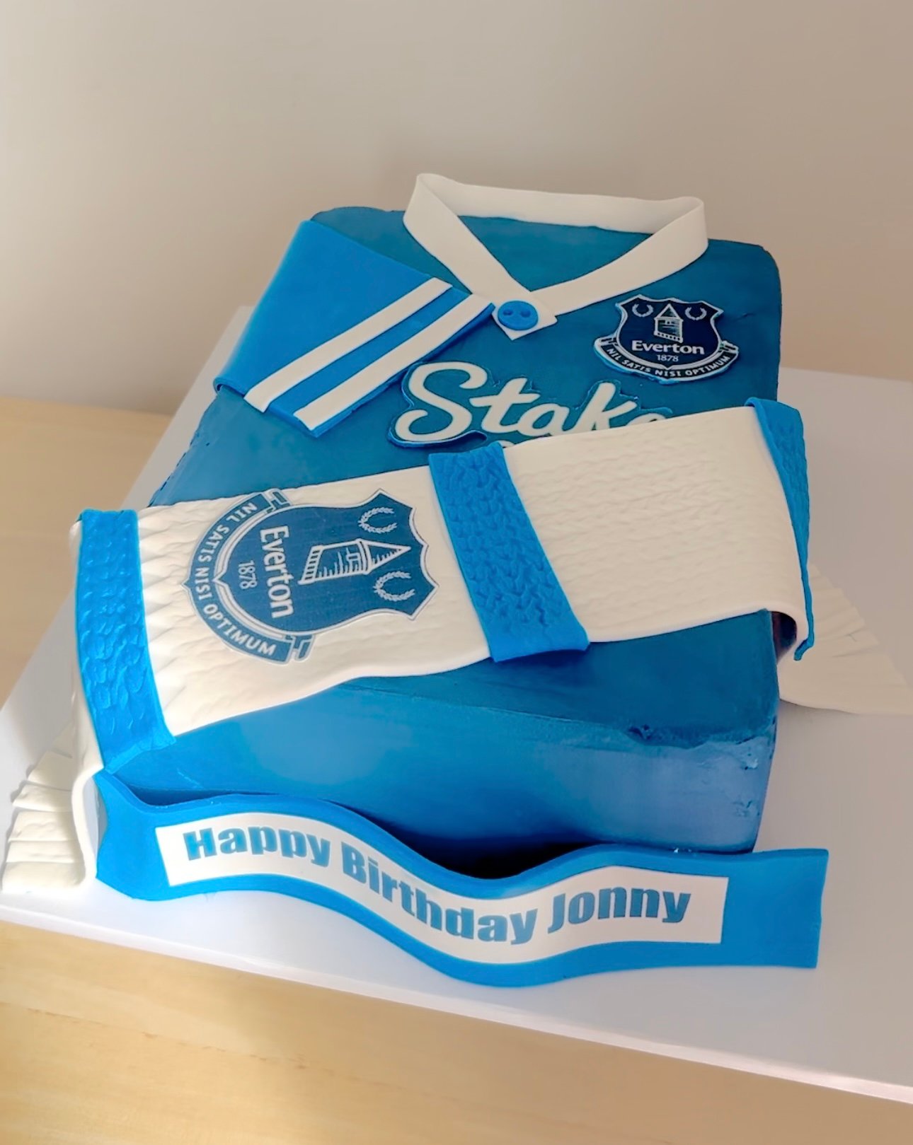 Celebrate a football fan’s special day with this striking Everton-themed cake. Designed to resemble the team’s jersey, this cake features intricate edible details, including a realistic shirt collar and team badge. A fondant scarf with a custom message completes the design, adding a personal touch. Perfect for any Everton supporter, this cake can be customised to represent any football team of your choice.
