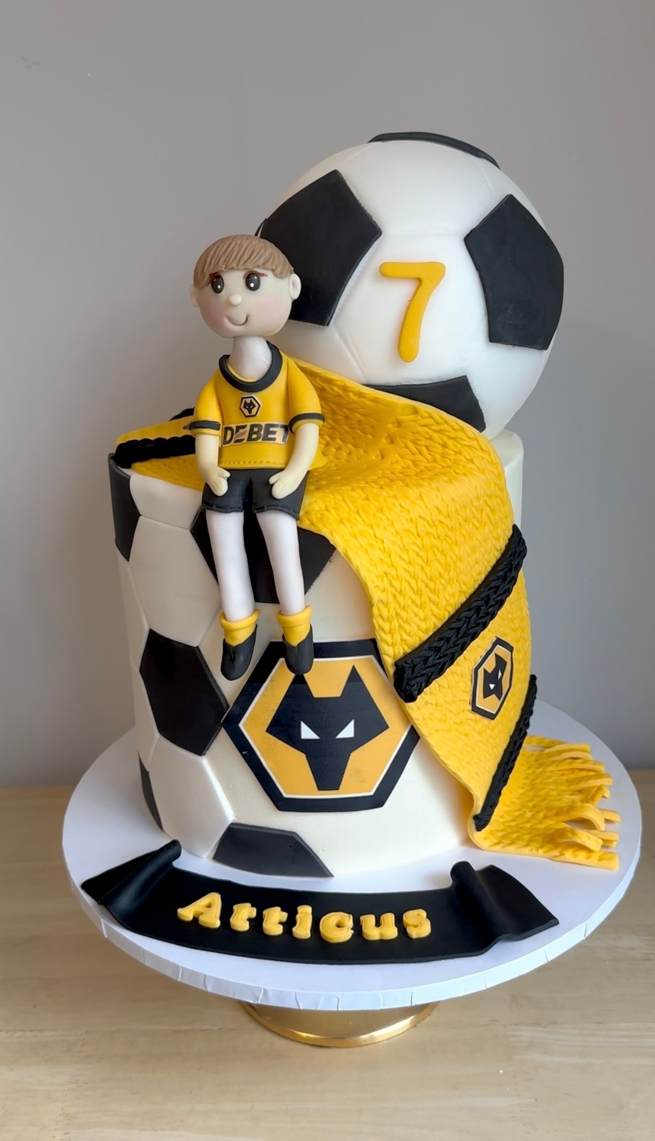 Celebrate in style with this striking Wolverhampton Wanderers-themed cake! Featuring a bold black and gold colour scheme, this design showcases the club’s emblem, hexagonal football patterns, and a knitted-effect fondant scarf draped across the tiers. A large football topper and an icing figurine dressed in a Wolves kit complete the look, making it the perfect centrepiece for any fan’s celebration. This cake can also be customised to represent any football team.