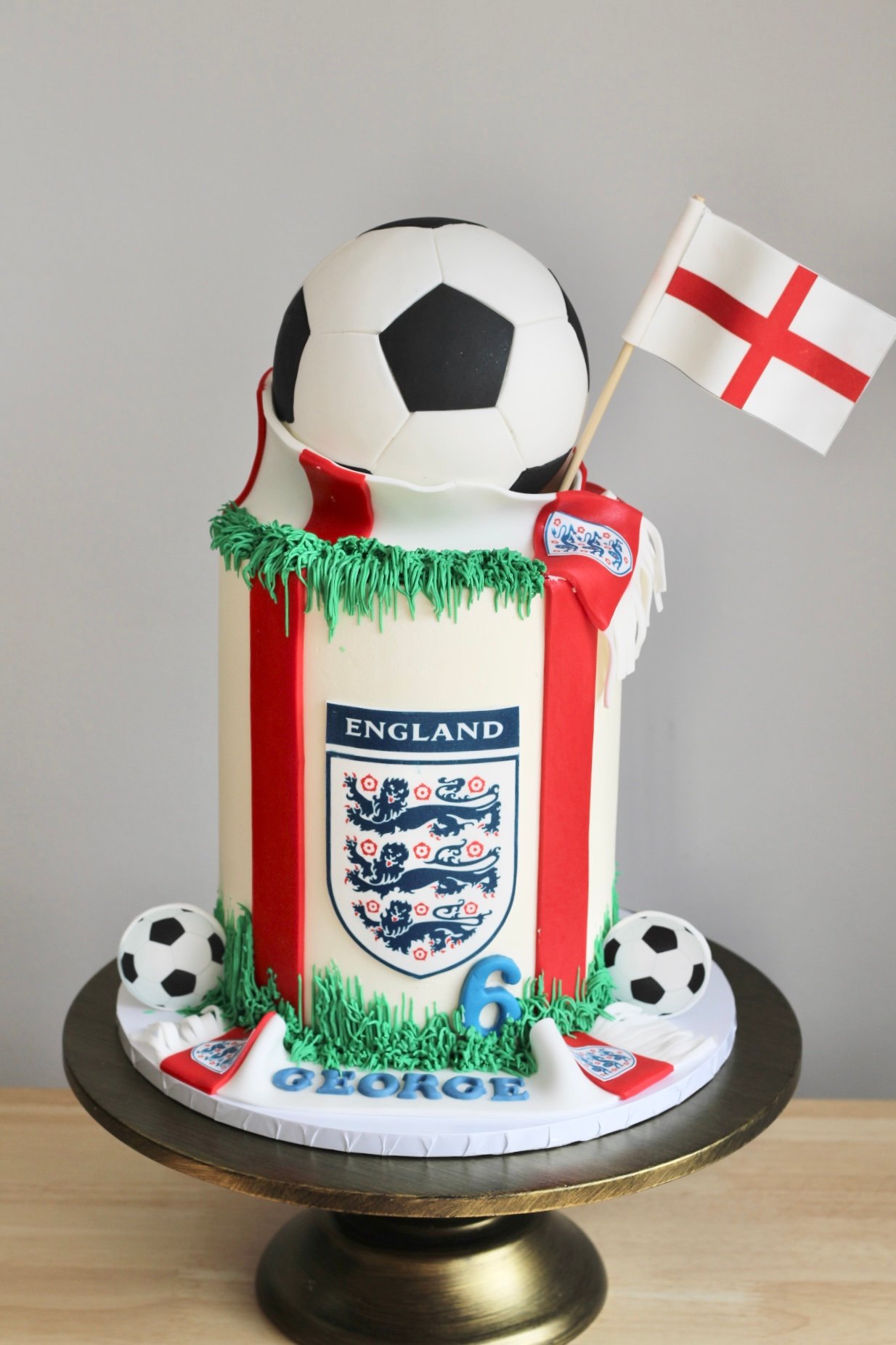 Show your support for England with this patriotic football cake. Featuring the iconic Three Lions crest, red and white fondant stripes, and a realistic football topper, this cake is perfect for any England fan. Edible grass detailing, a fondant scarf, and a miniature England flag add to the impressive design, making it a standout choice for any celebration.