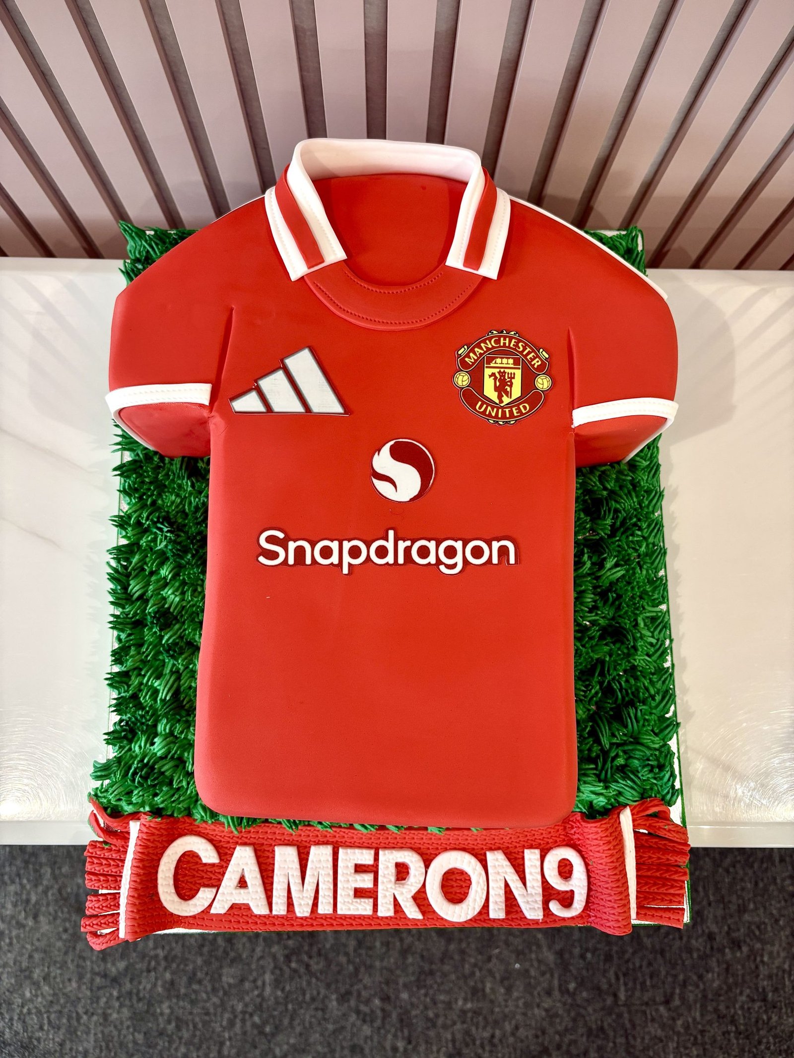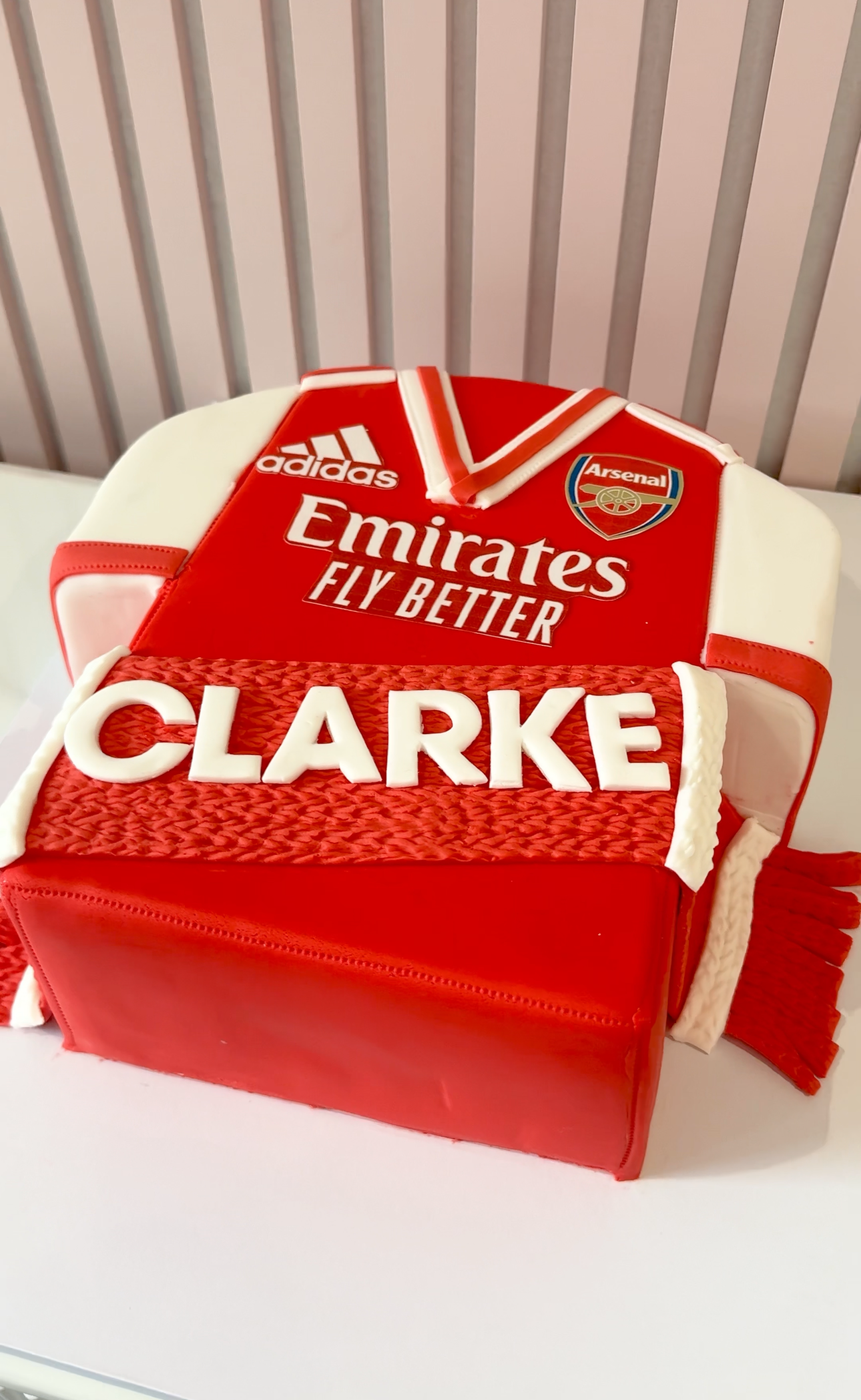 Celebrate like a true Gunner with this Arsenal football shirt cake, perfect for fans of all ages. Styled to look just like the club’s iconic red and white kit, it features a personalised name scarf draped across the base. Whether you’re marking a birthday or a big win, this cake can be customised for any football team.